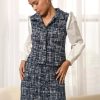 Cropped tweed coat. The cream piece is adorned with pink sleeves and pearl button embellishments. The blazer is decorated with pocket flaps.