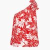 This vibrant blouse features a charming multi-color floral or abstract print on a dark background, creating a lively contrast. The design includes a flattering V-neckline with delicate ruffle details, long semi-sheer sleeves with elastic cuffs, and a defined peplum waist that creates a beautiful, feminine silhouette.