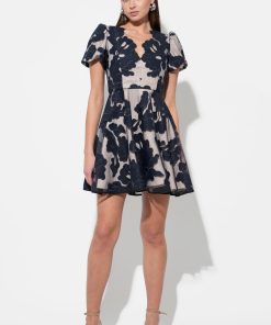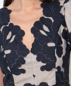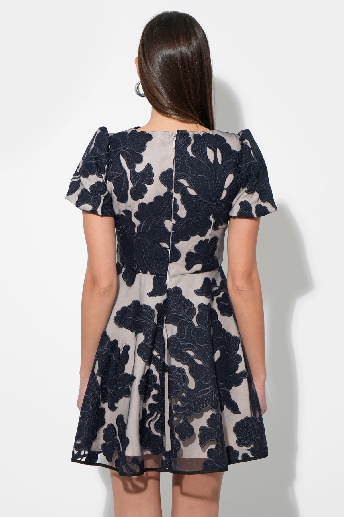 It features a nude-colored base fabric layered with a delicate, sheer navy mesh overlay that is adorned with a beautiful, all-over floral embroidery pattern. The dress has a flattering mini length and a defined A-line silhouette.
