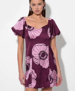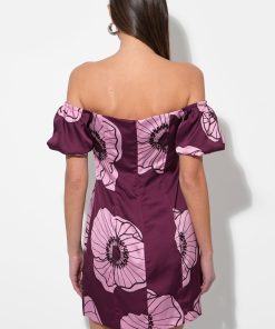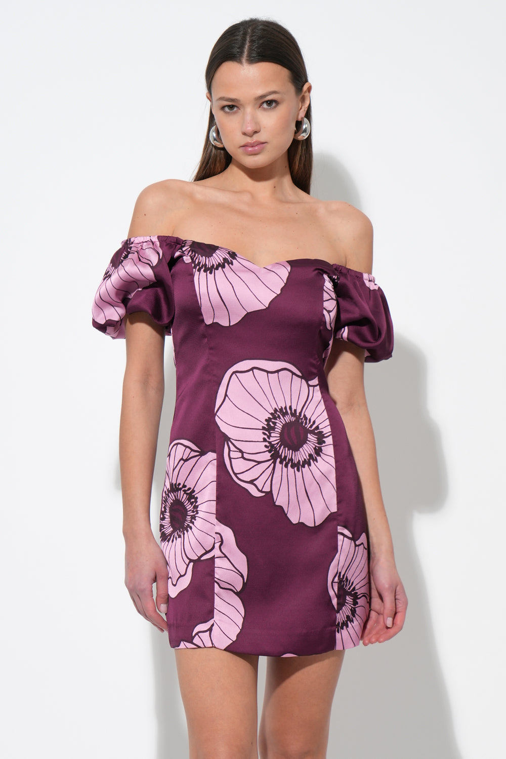 It features a chic off-the-shoulder neckline, beautifully framed by voluminous puff sleeves that add a touch of playful drama. The defined waist cinches to create a flattering silhouette, flowing into a softly gathered or pleated mini skirt.