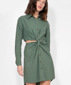 This midi-length dress features crisp vertical stripes in refreshing shades of blue and white, offering a timeless and flattering aesthetic. It is designed with a classic shirt collar, a full button-front closure, and long sleeves that can be styled rolled up for a more casual feel.