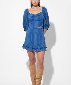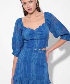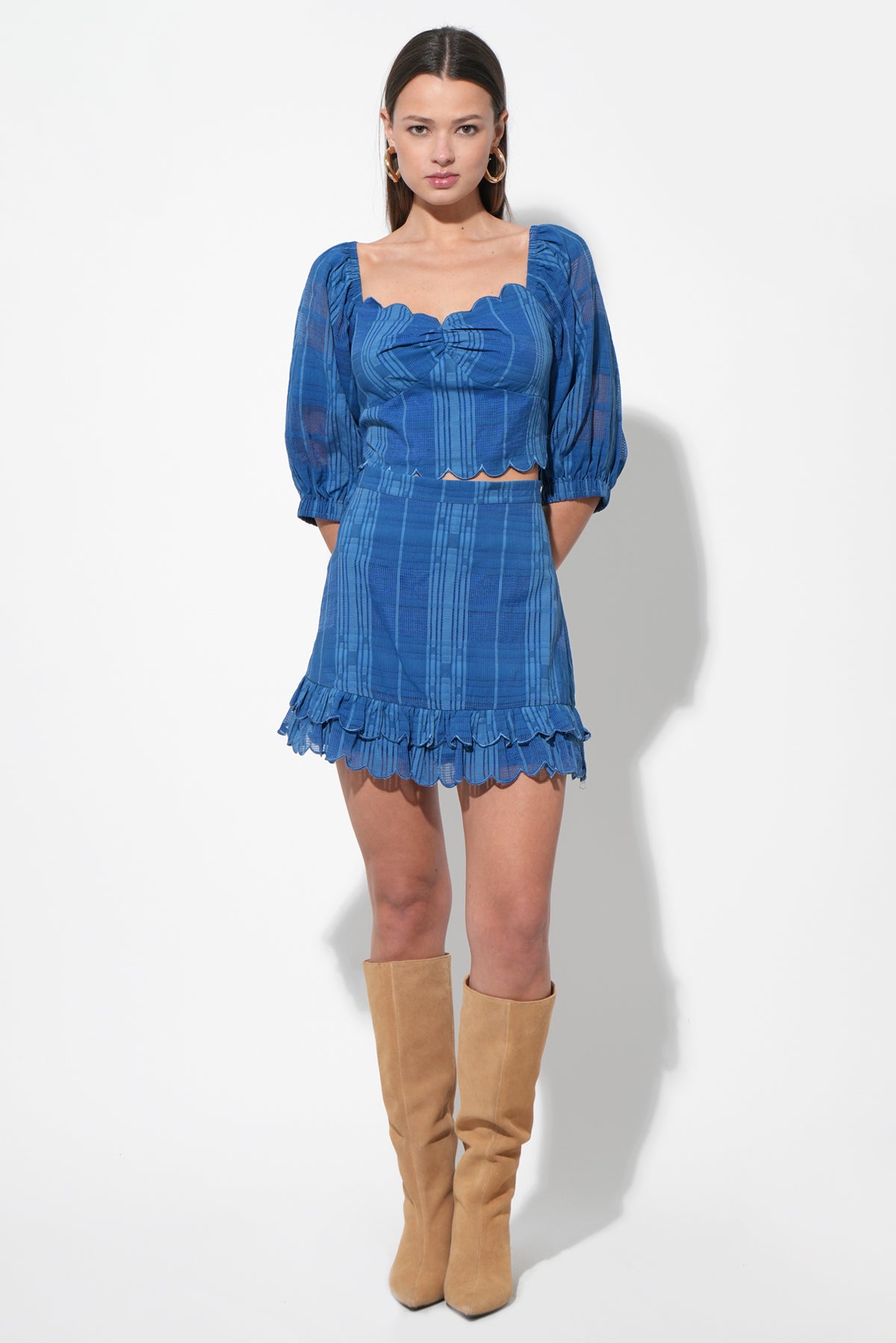 This chic mini skirt, in a crisp light hue, features a sophisticated jacquard stripe pattern that adds subtle texture and visual interest. Its defining detail is the charming scalloped hemline, which creates a unique and feminine finish.