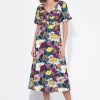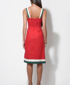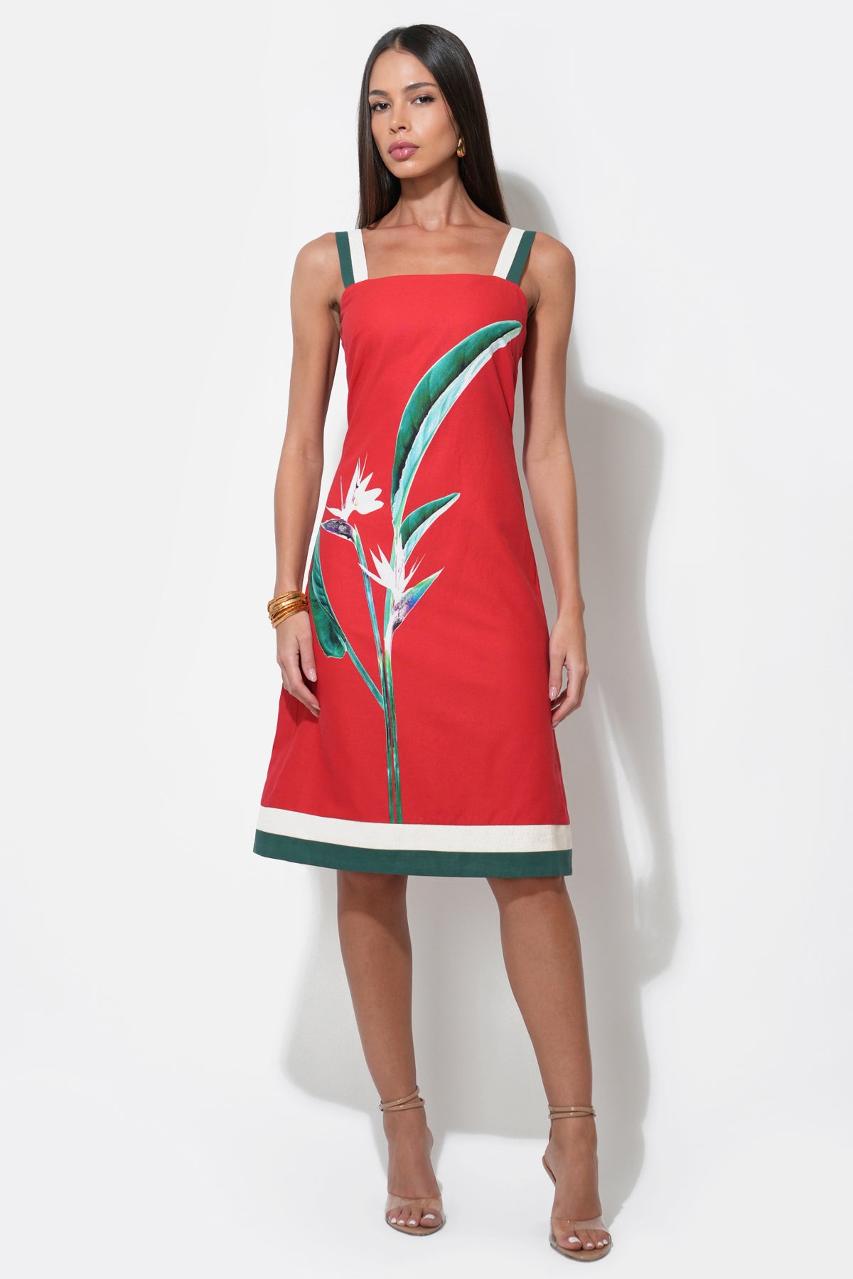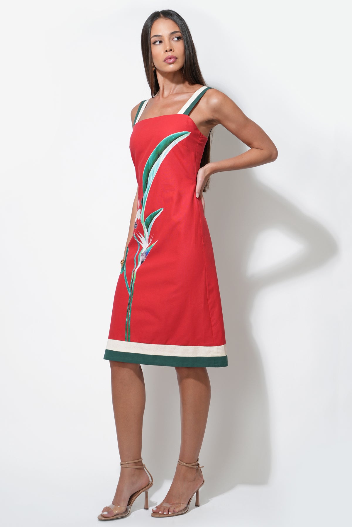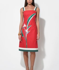 This piece captures the essence of a tropical escape with its bold, burnt red fabric beautifully showcasing a striking “Bird of Paradise” floral print. The dress features modern, contrasting wide straps in white with a hint of forest green, echoing the chic trim at the hem. Designed with a flattering square neckline and a fitted bodice that subtly flares into a comfortable midi skirt, this dress exudes effortless style.