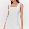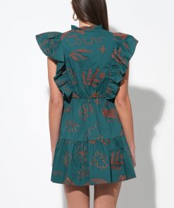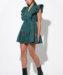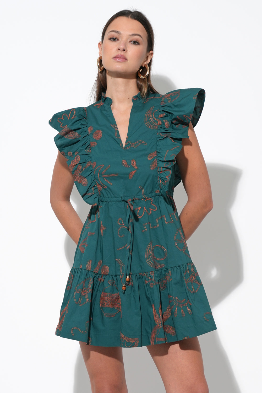 This delightful mini dress, in a beautiful light hue, is adorned with intricate embroidery, adding a touch of artisanal elegance. It features a flattering V-neckline with a delicate tie detail, allowing for adjustable styling, and romantic flutter sleeves that enhance its feminine appeal.