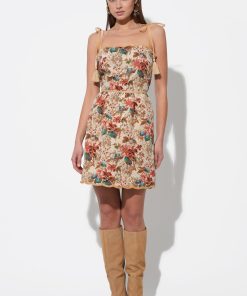 This delightful mini dress features a vibrant tapestry-inspired print in a rich palette of blues, oranges, and creams, making it a true statement piece.
