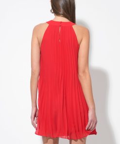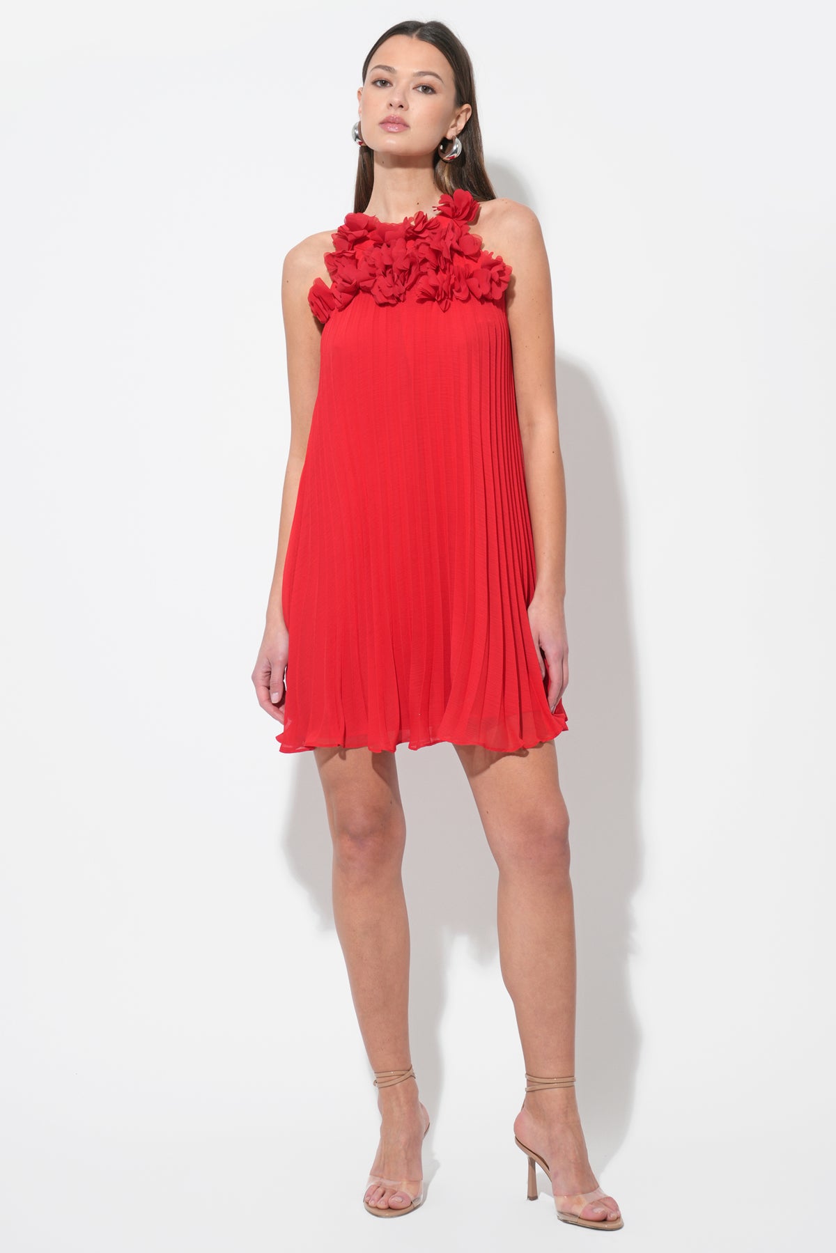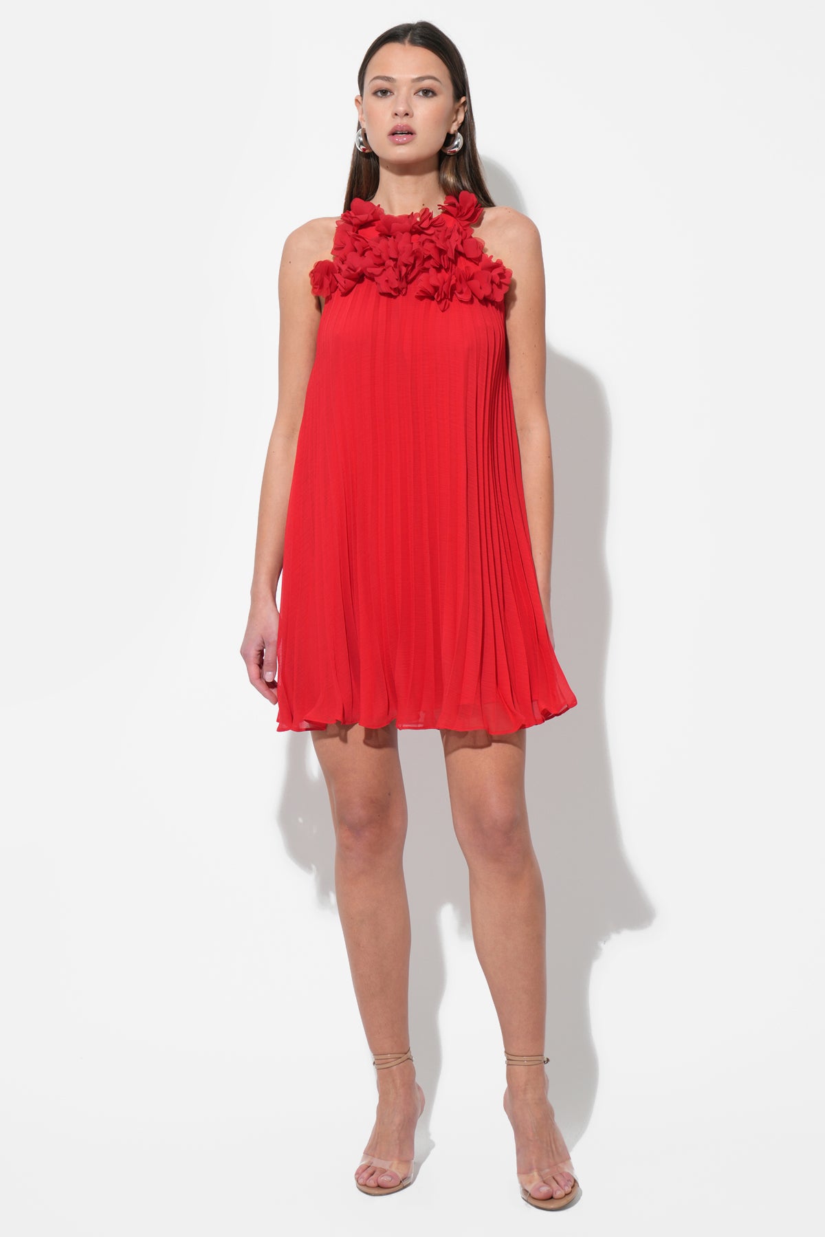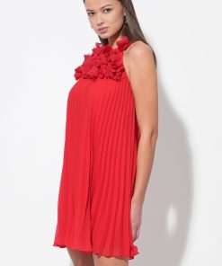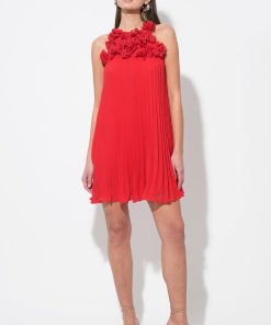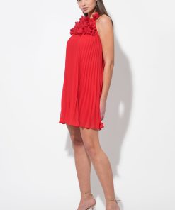 This stunning red mini dress features a unique halter neckline adorned with an array of meticulously crafted 3D floral appliques, creating a beautiful and tactile texture. The dress flows into a flattering pleated A-line silhouette, offering graceful movement and a comfortable fit.