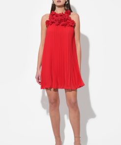This stunning red mini dress features a unique halter neckline adorned with an array of meticulously crafted 3D floral appliques, creating a beautiful and tactile texture. The dress flows into a flattering pleated A-line silhouette, offering graceful movement and a comfortable fit.