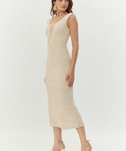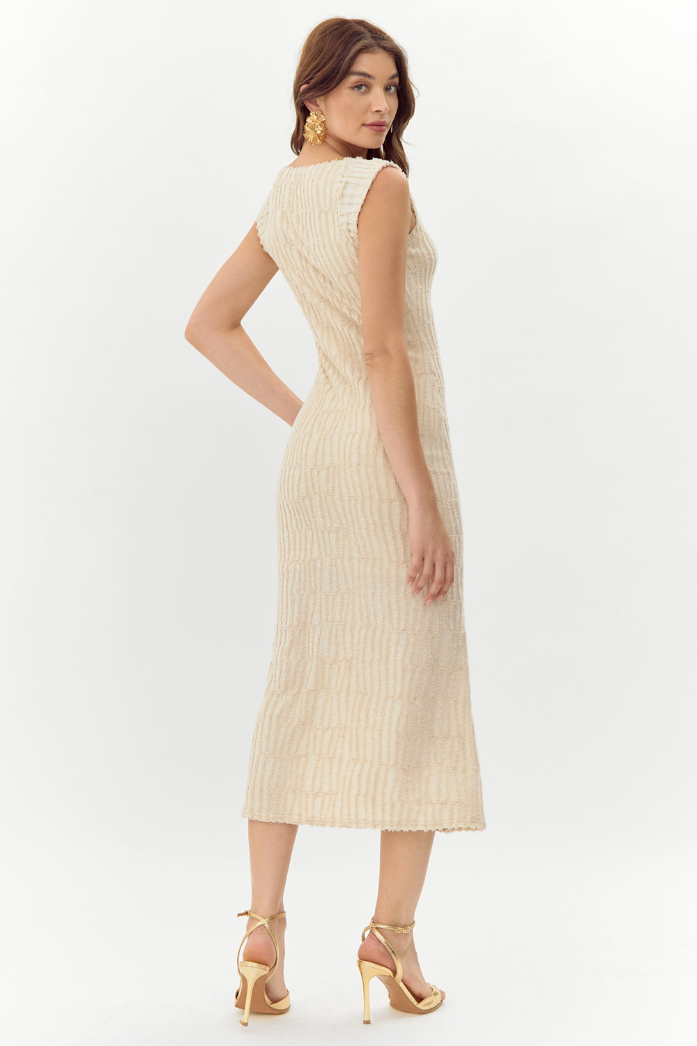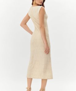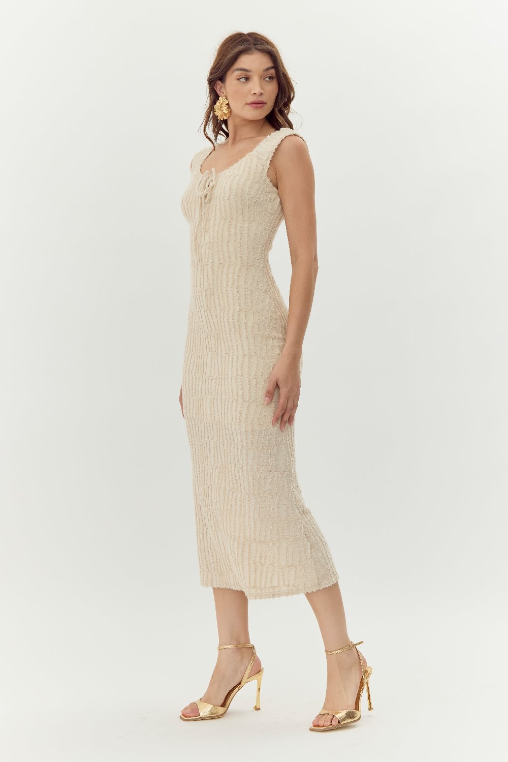 Adelyn Rae Women’s Delaney Front Tie Textured Burnout Knit Midi Dress | Beige Gold