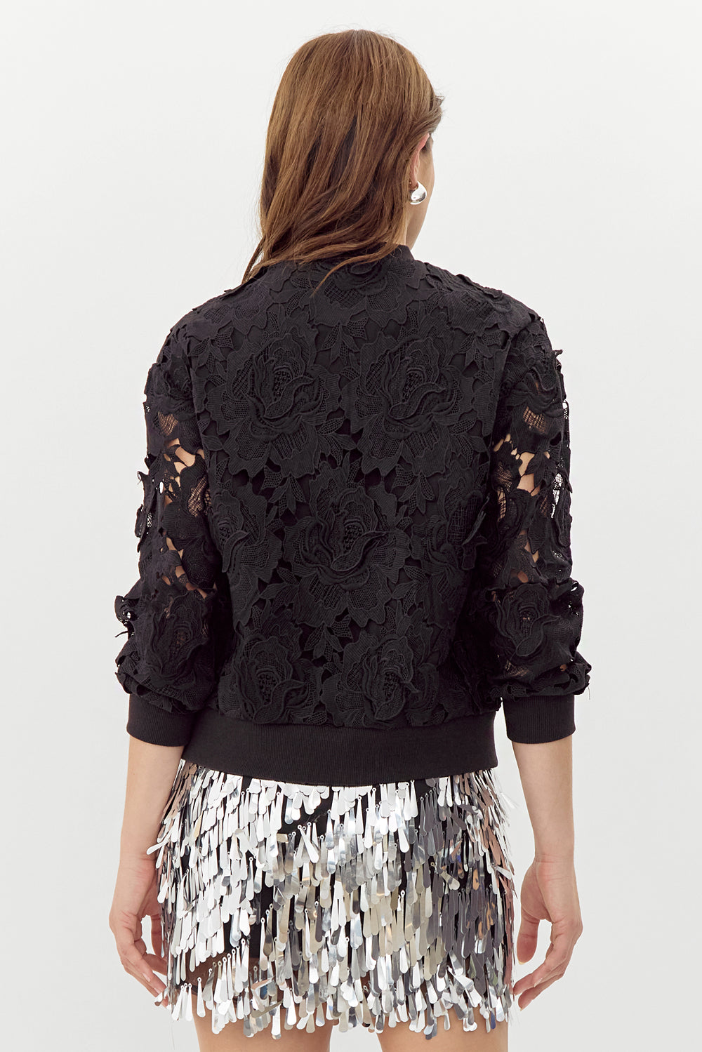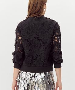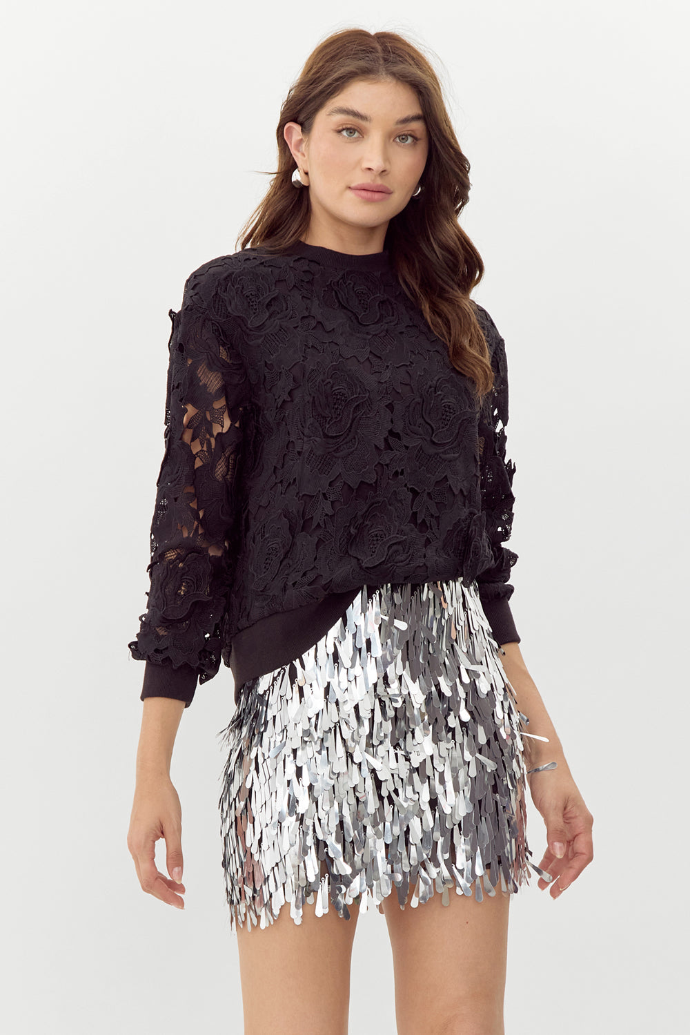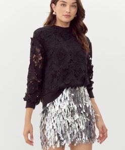 Lace blouse with a pullover sweater structure. This piece can be styled with any bottoms for a classy touch.