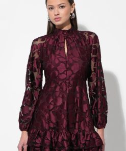 This vibrant blouse features a charming multi-color floral or abstract print on a dark background, creating a lively contrast. The design includes a flattering V-neckline with delicate ruffle details, long semi-sheer sleeves with elastic cuffs, and a defined peplum waist that creates a beautiful, feminine silhouette.