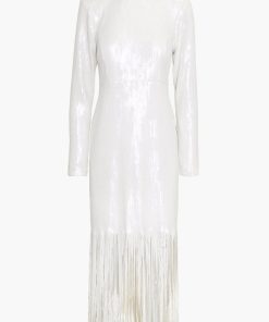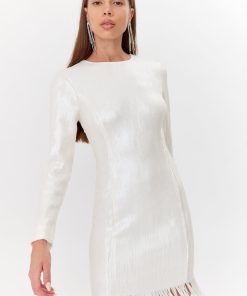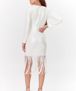 Knee-length, sequin dress decorated with sequins. The dress is finished off with sequin fringes along the hem of the skirt.