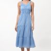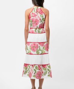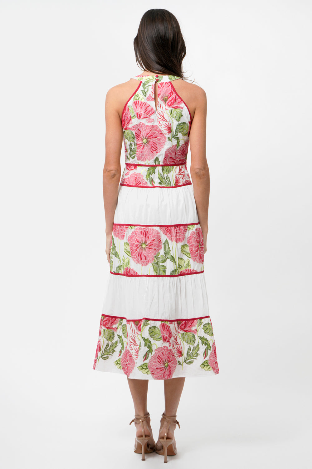 The Haven Dress stuns with vibrant floral embroidery, a flattering halter neckline, and tiered skirt panels trimmed with contrast piping for a polished finish. Designed to skim the waist and flow effortlessly into a midi length, this dress strikes the perfect balance between structure and movement.
