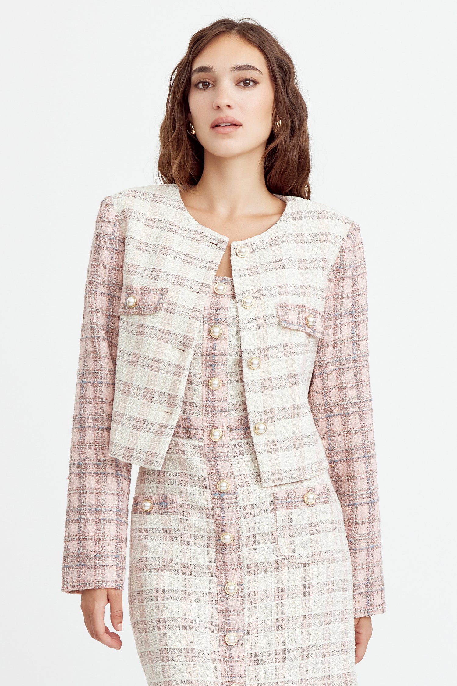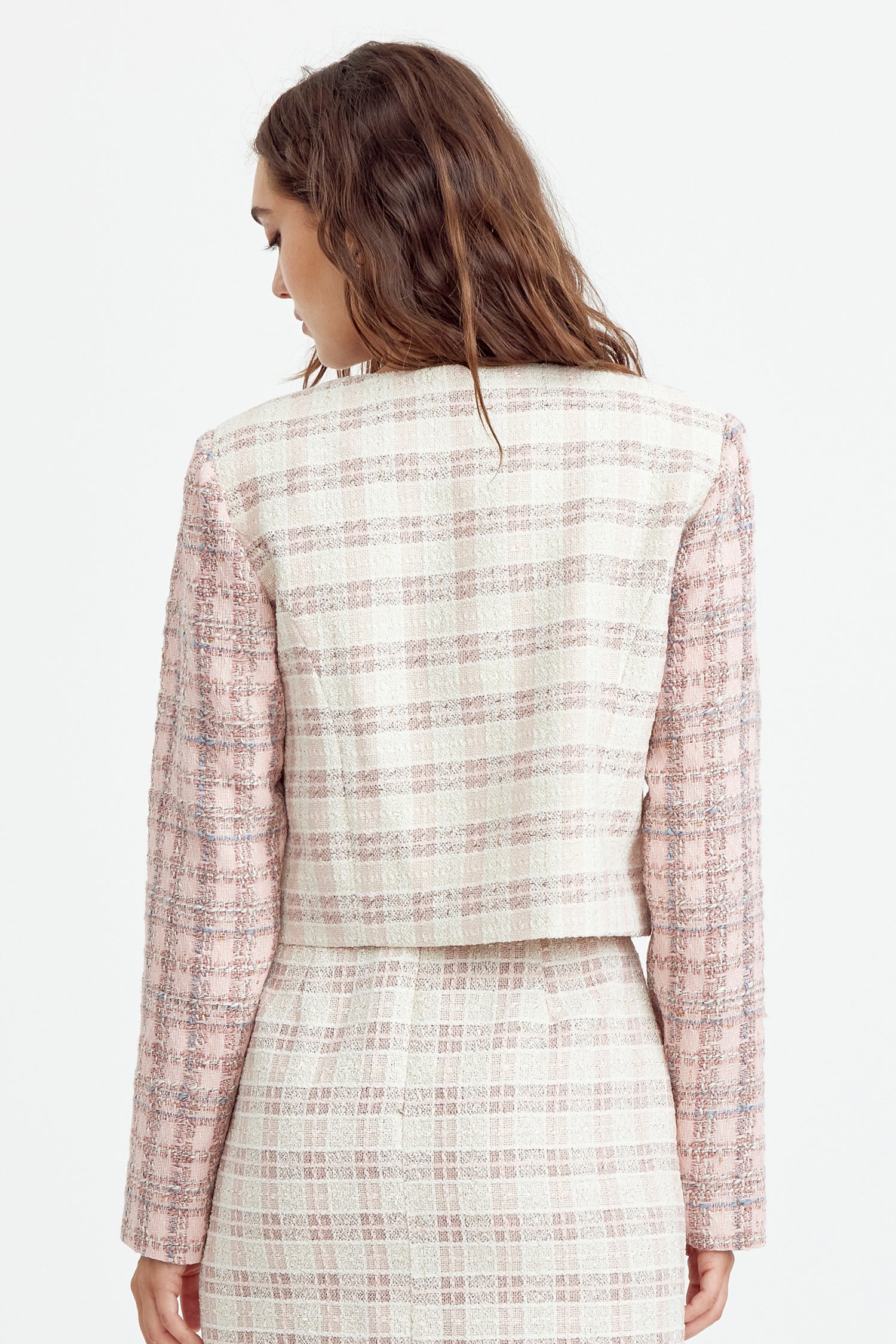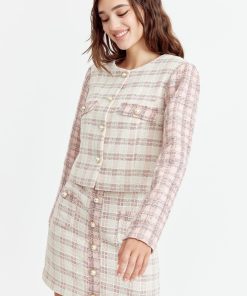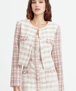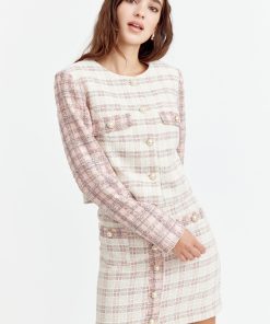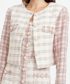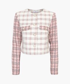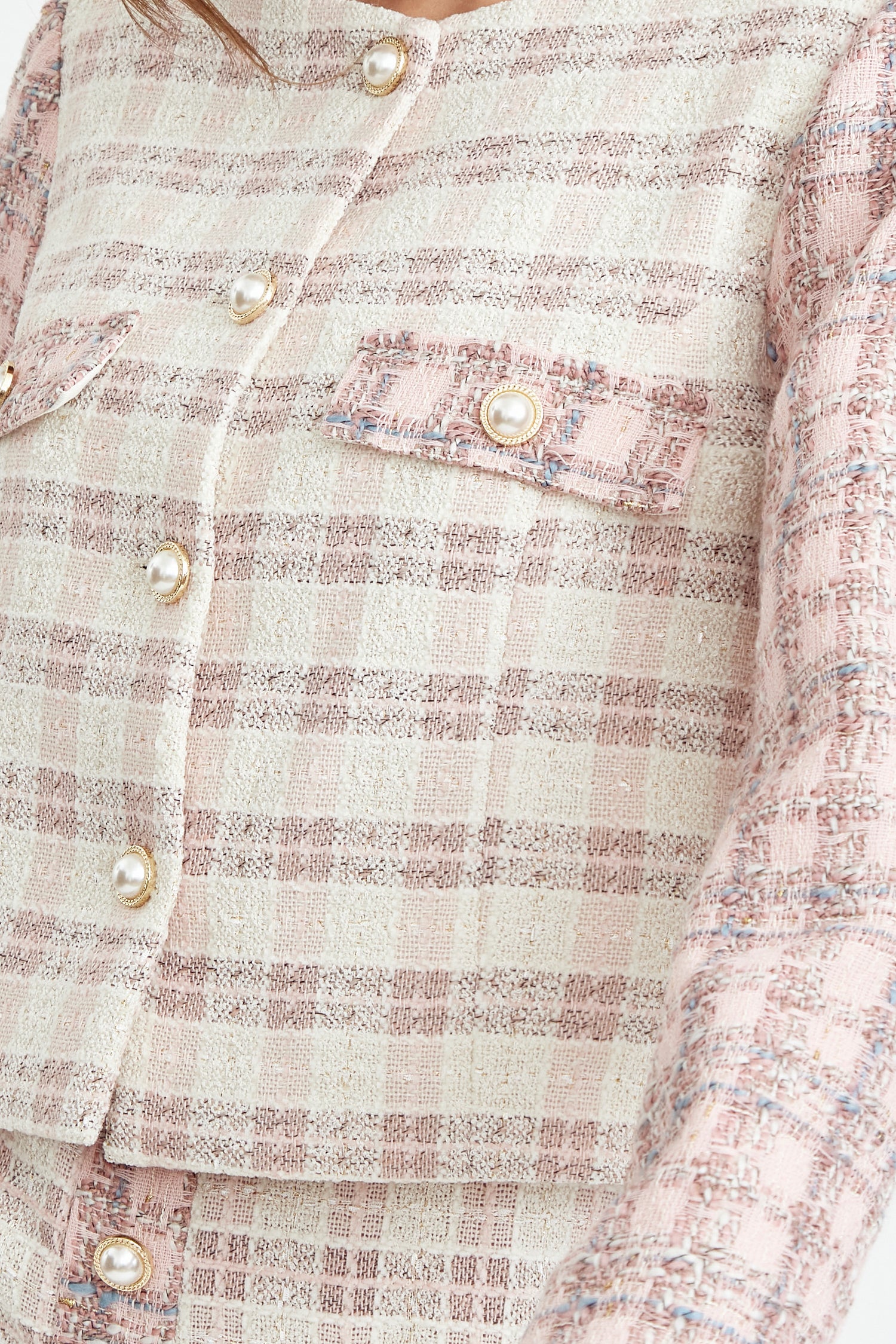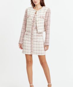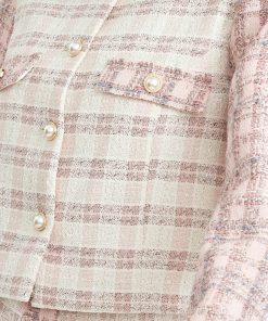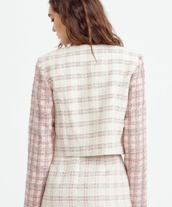 Cropped tweed coat. The cream piece is adorned with pink sleeves and pearl button embellishments. The blazer is decorated with pocket flaps.