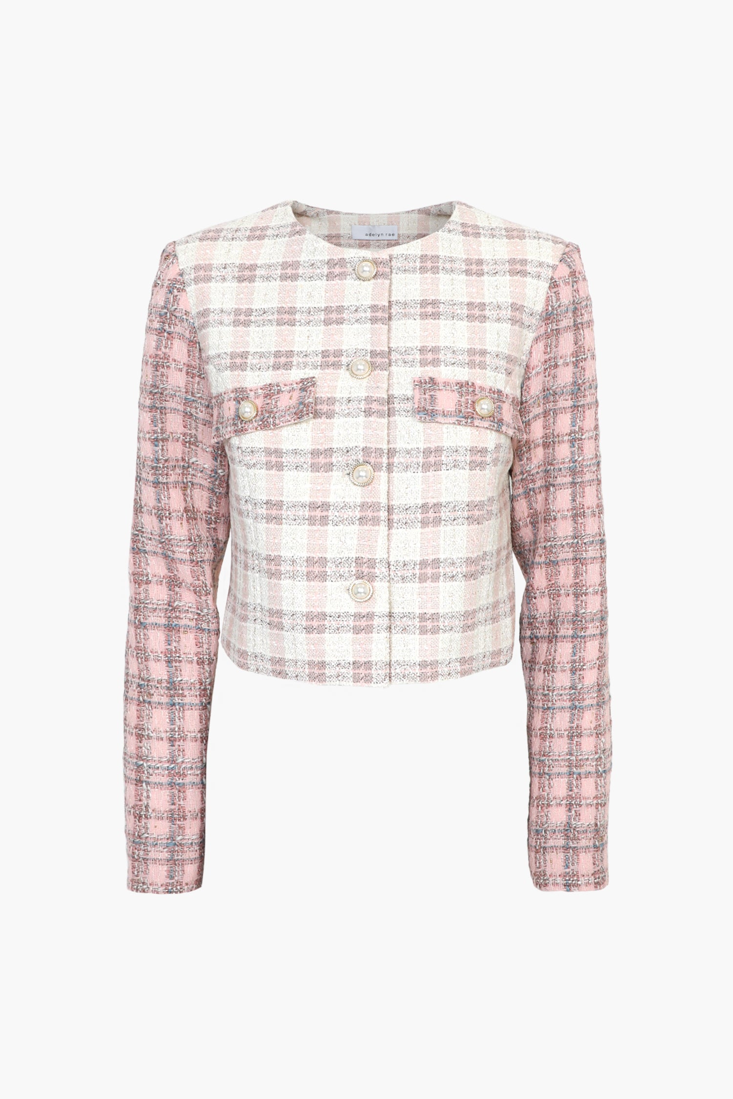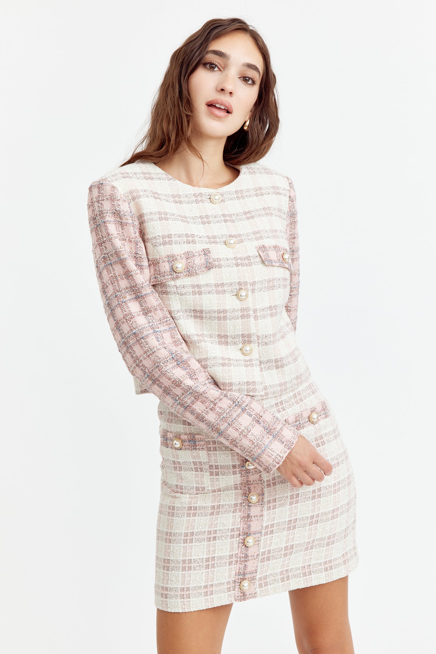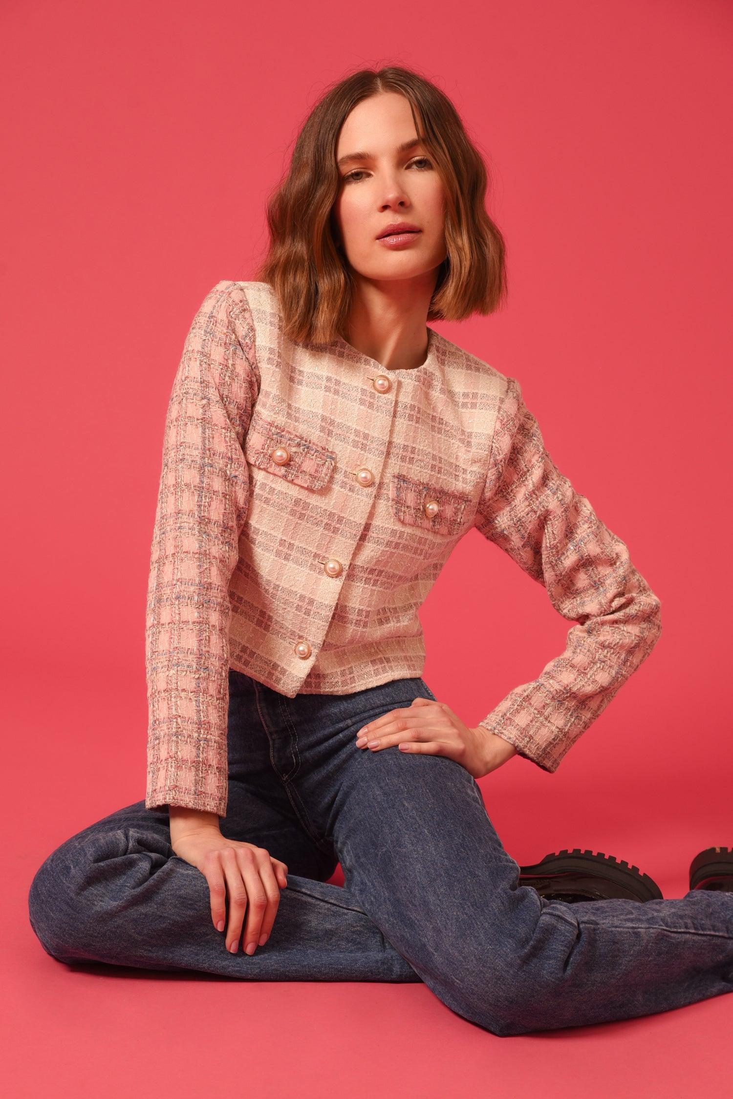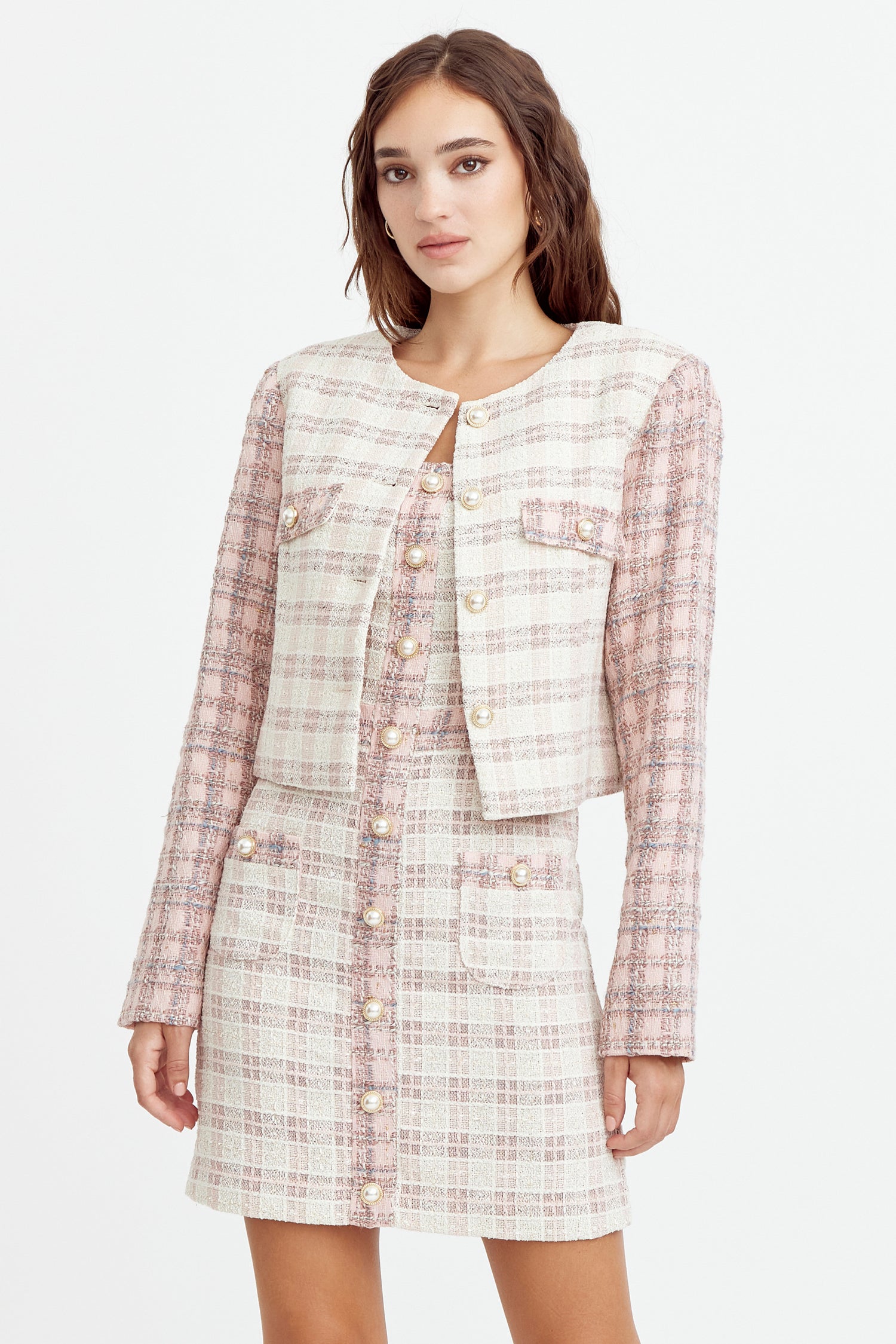 Cropped tweed coat. The cream piece is adorned with pink sleeves and pearl button embellishments. The blazer is decorated with pocket flaps.