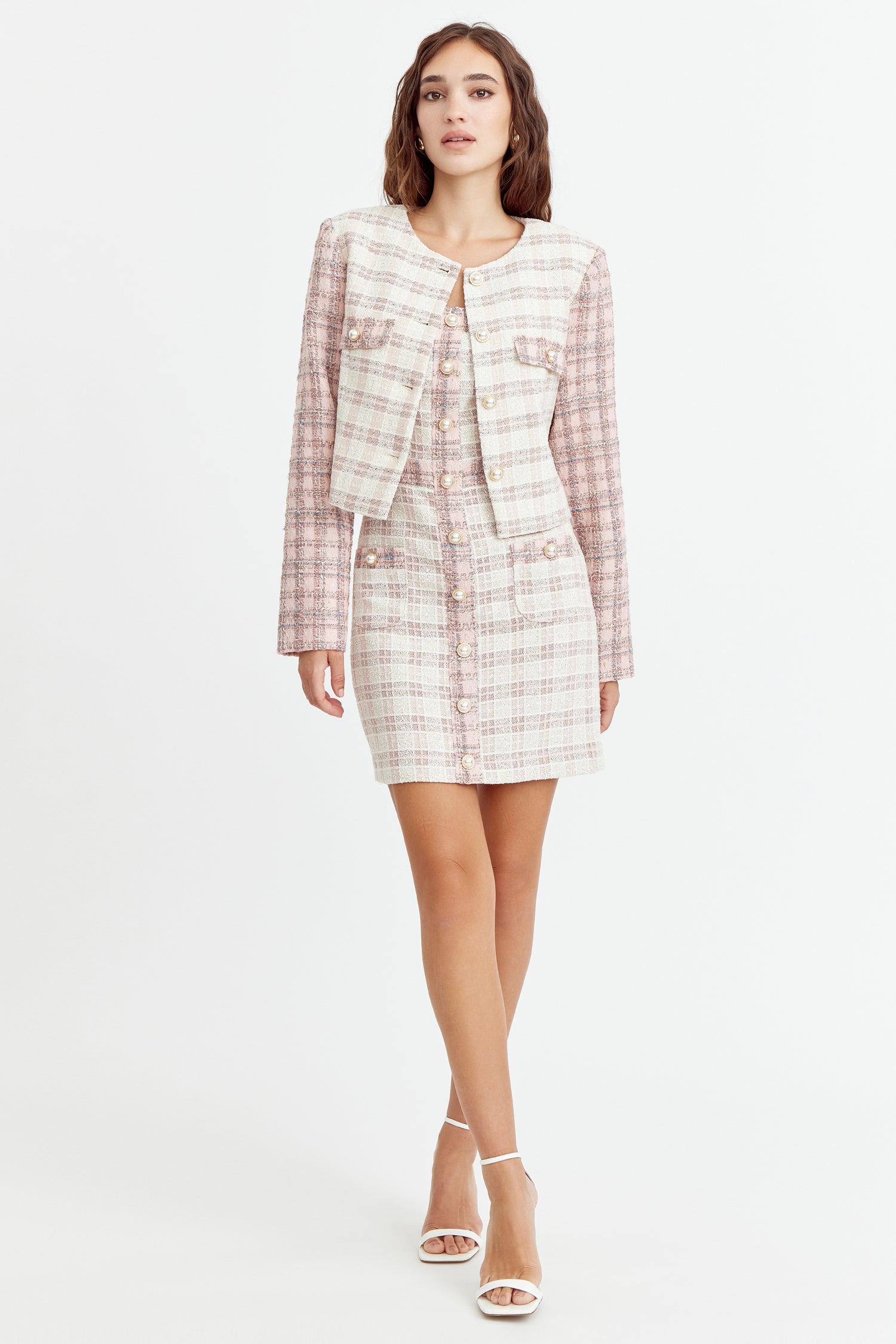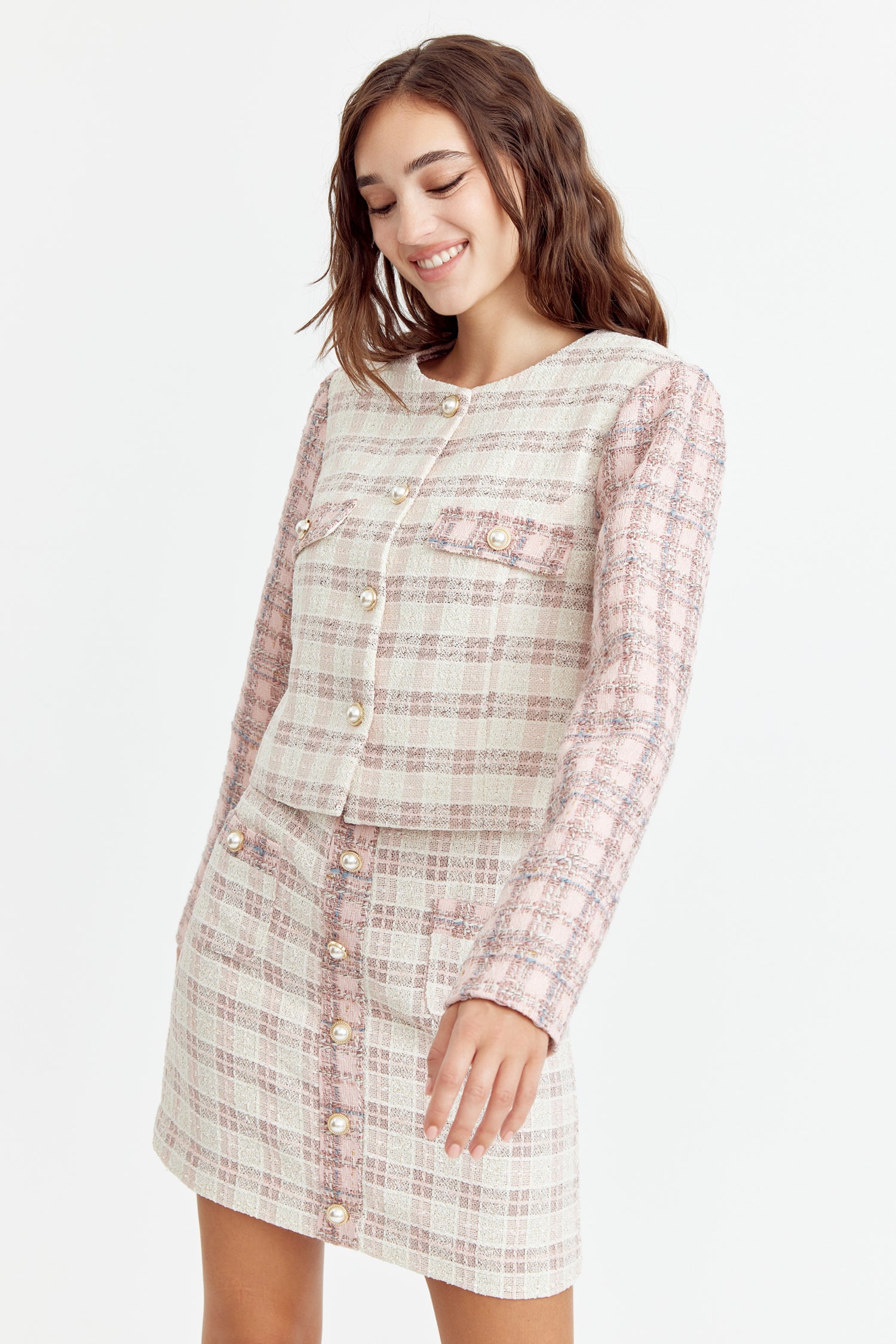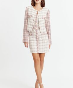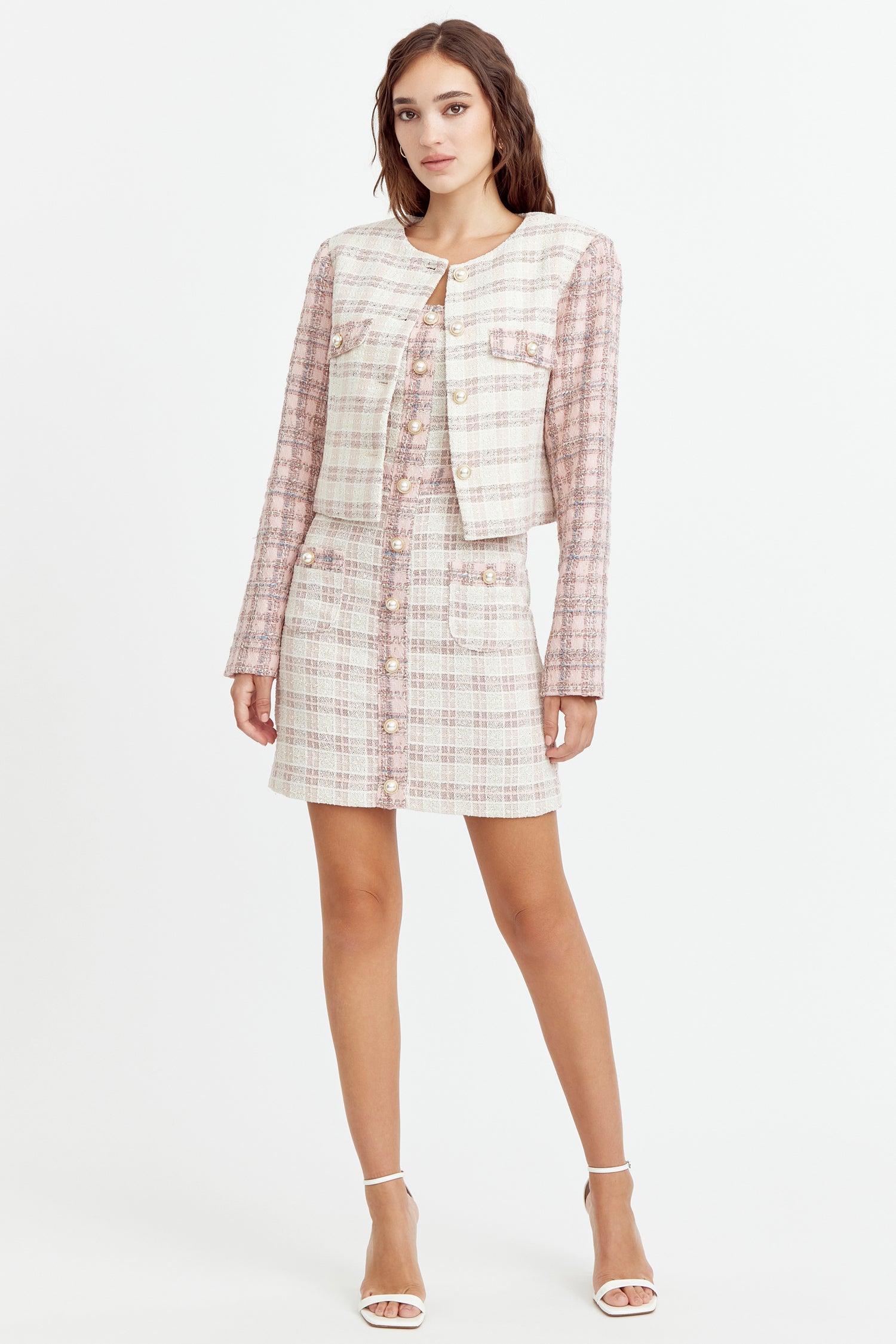 Cropped tweed coat. The cream piece is adorned with pink sleeves and pearl button embellishments. The blazer is decorated with pocket flaps.