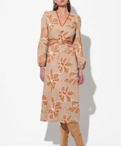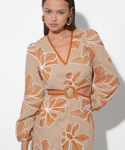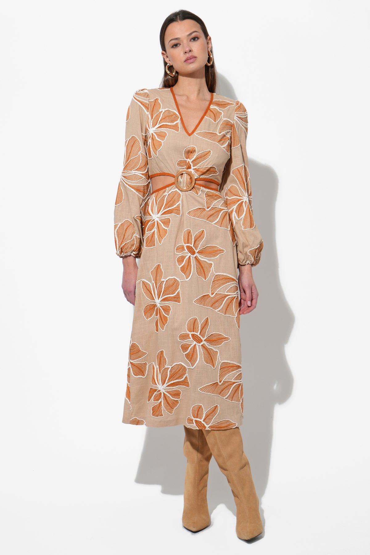 This stunning maxi dress, in a fresh white or cream hue, is adorned with delicate embroidery across the bodice and throughout the design, adding an artisanal touch. It features a flattering V-neckline and stylish puff sleeves with comfortable elasticated cuffs.