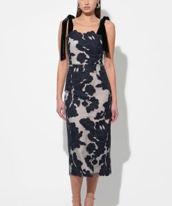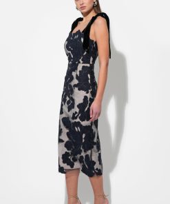 It features a nude-colored base fabric that is overlaid with a sheer navy mesh and adorned with a large, intricate, floral embroidery pattern in navy. The dress has a flattering midi length and a pencil-style silhouette that is fitted through the waist and hips.