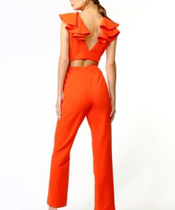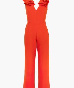 Crafted lightweight, stretchy fabric, this jumpsuit is both comfortable and flattering, creating a sleek and streamlined silhouette that will turn heads wherever you go. The bold blood orange color along with the famous ruffled shoulders is daring, radiating a confident energy with its captivating hue.