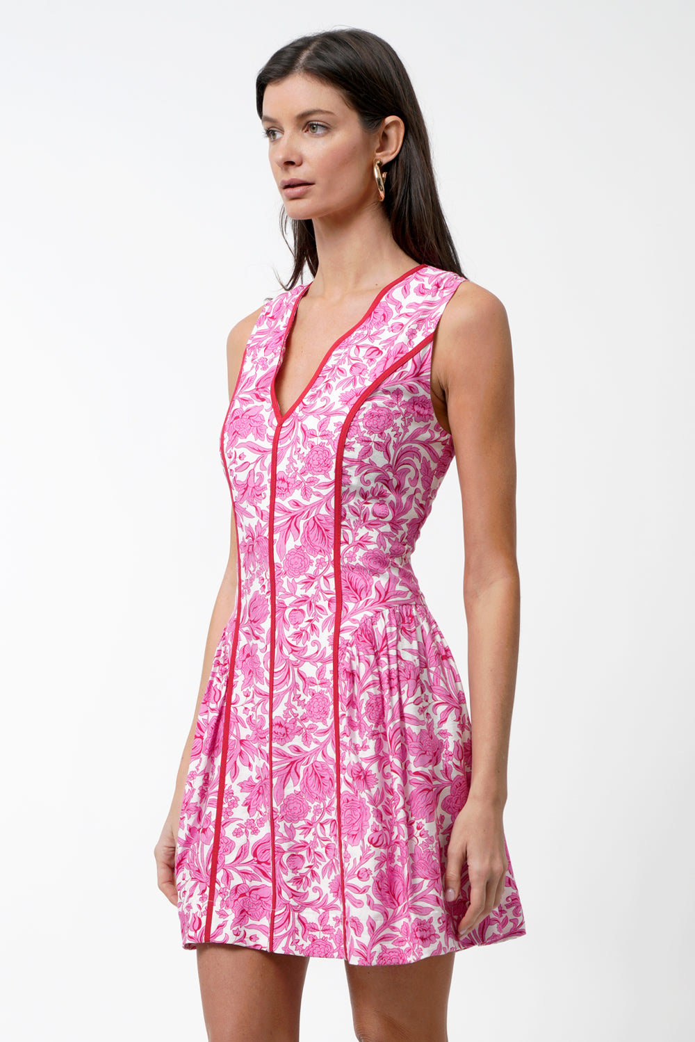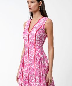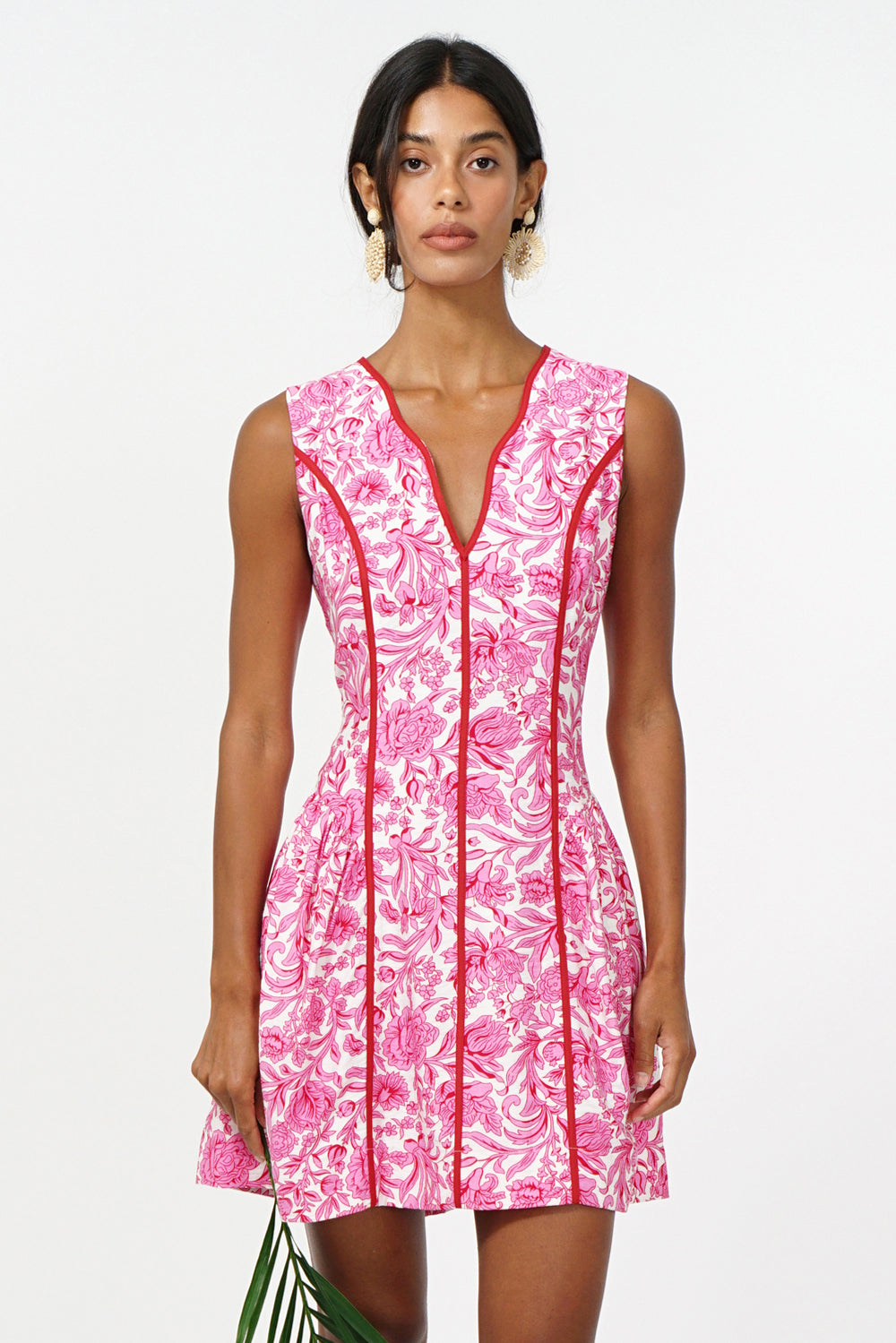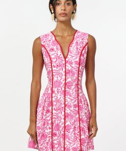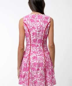 This sleeveless A-line silhouette pops in a vibrant pink floral print, accented with bold contrast piping that defines your shape and adds the sweetest touch of structure. The scalloped split neckline brings a playful twist, while the pleated skirt gives it that easy, twirl-worthy movement we live for.