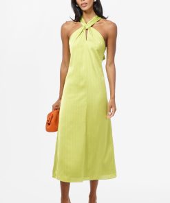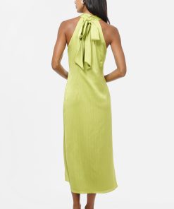 Cue the drama. The Kristine Back Bow Satin Midi Dress is sleek, stunning, and seriously statement-making. Designed in a juicy chartreuse satin with a subtle textured finish, this dress features a twisted halter neckline with a peekaboo front cutout and an oversized bow that ties in back for a dramatic exit moment.