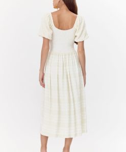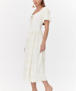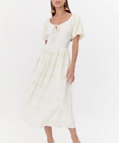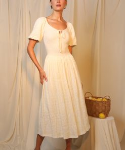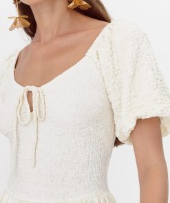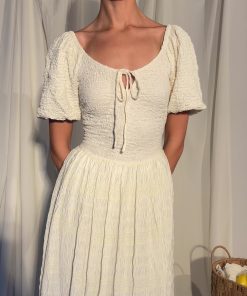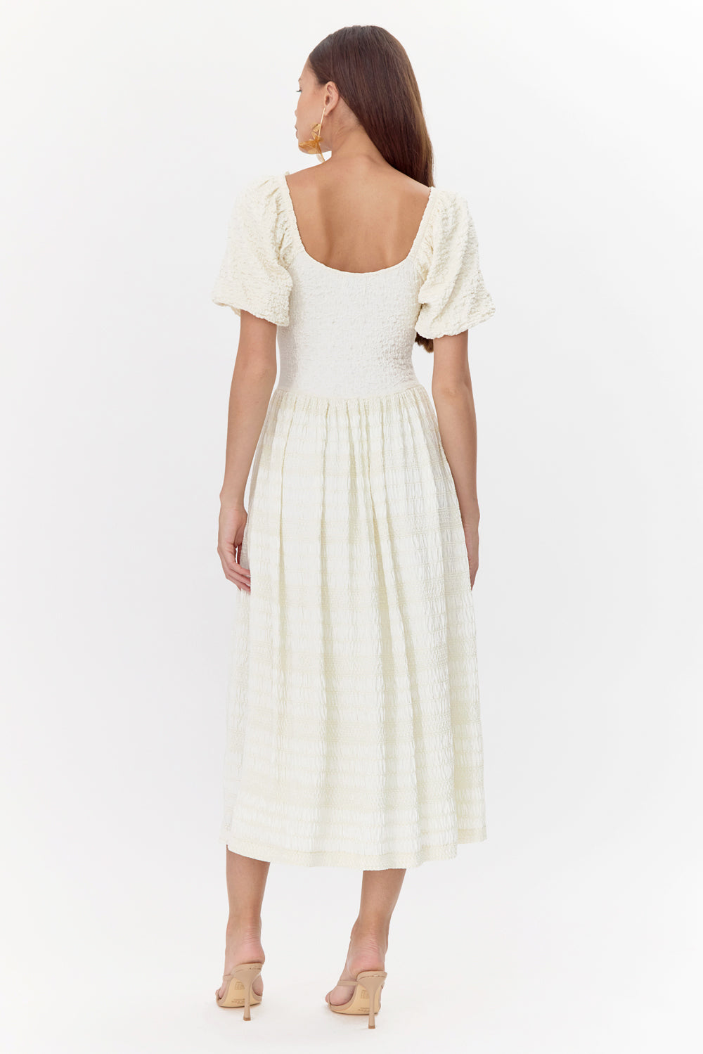 Popcorn-textured, mid dress featuring balloon sleeves and a tied neckline. Showcasing a tightly-fitted bodice and flared skirt, the dress is complimented with a scoop neckline, which can be pulled down for an off-shoulder look.