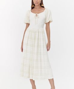 Popcorn-textured, mid dress featuring balloon sleeves and a tied neckline. Showcasing a tightly-fitted bodice and flared skirt, the dress is complimented with a scoop neckline, which can be pulled down for an off-shoulder look.
