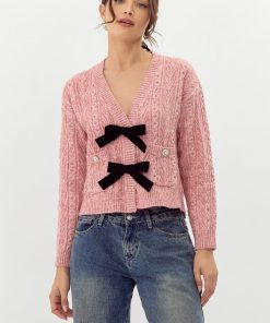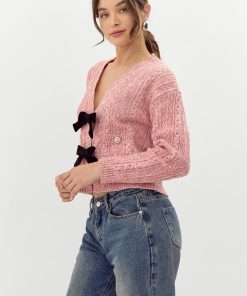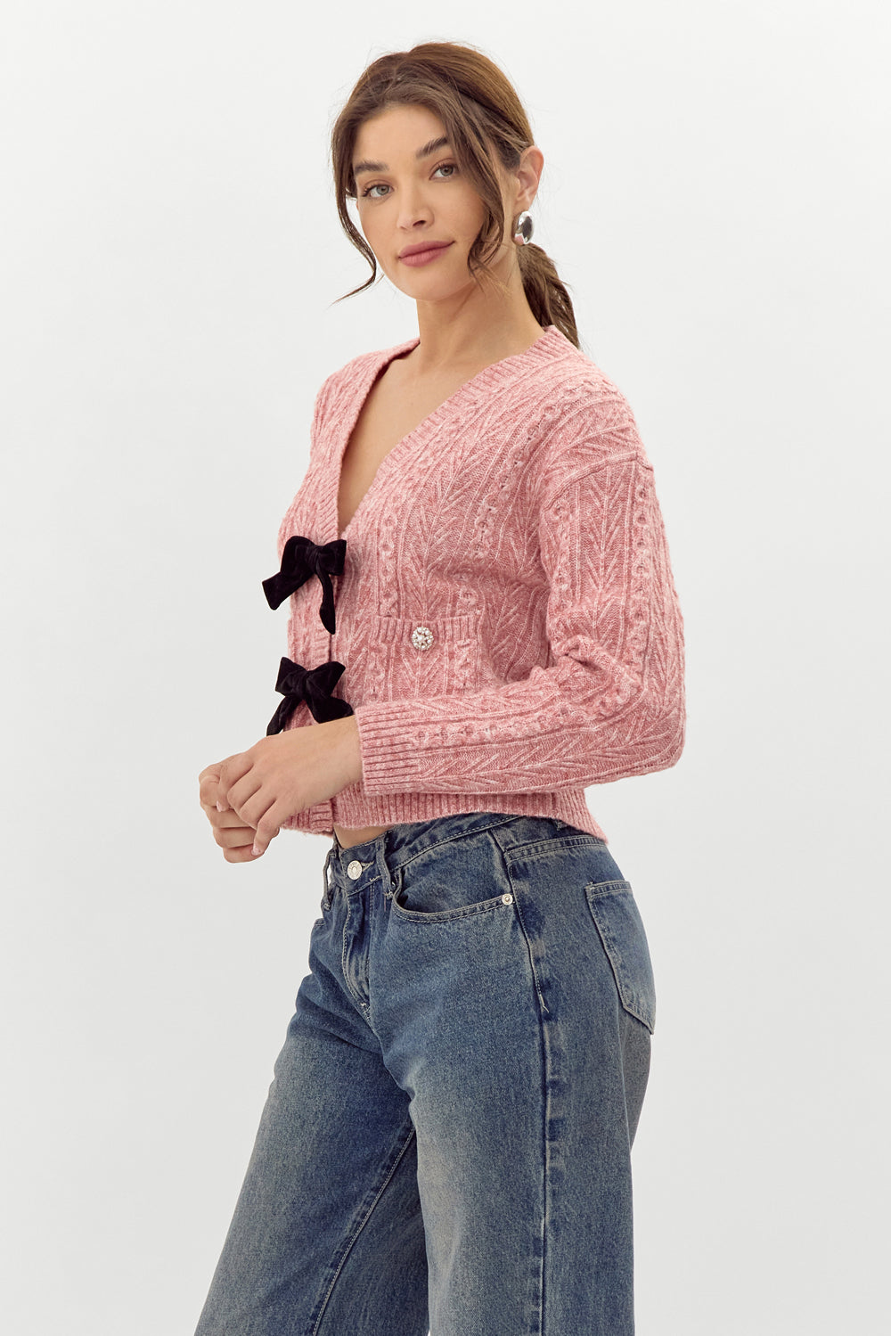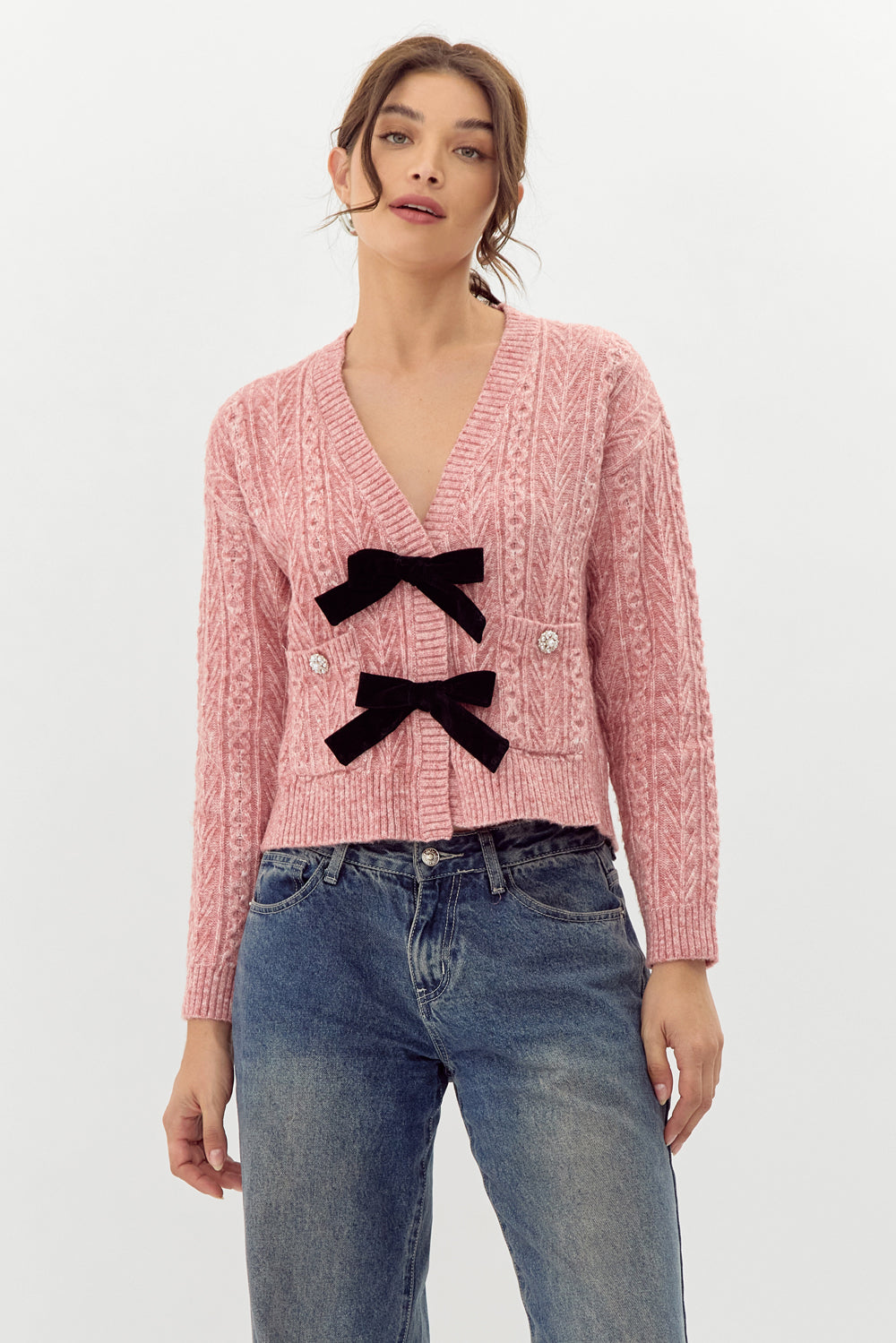 Add some feminine flare to your wardrobe in the Kendall Bow Front Jeweled Cardigan. It has a cable knit pattern throughout and features ribbon tie closures along the front opening. Wear it over a fitted top and pair it with a skirt and boots.