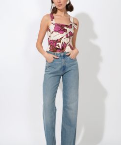 This floral crop top showcases a twisted bodice with pleated details. The adjustable straps are adorned with parallel stitching and the back is installed with a smocked panel.