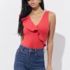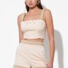 This floral crop top showcases a twisted bodice with pleated details. The adjustable straps are adorned with parallel stitching and the back is installed with a smocked panel.