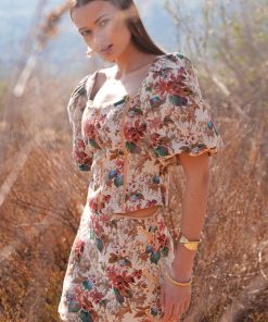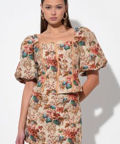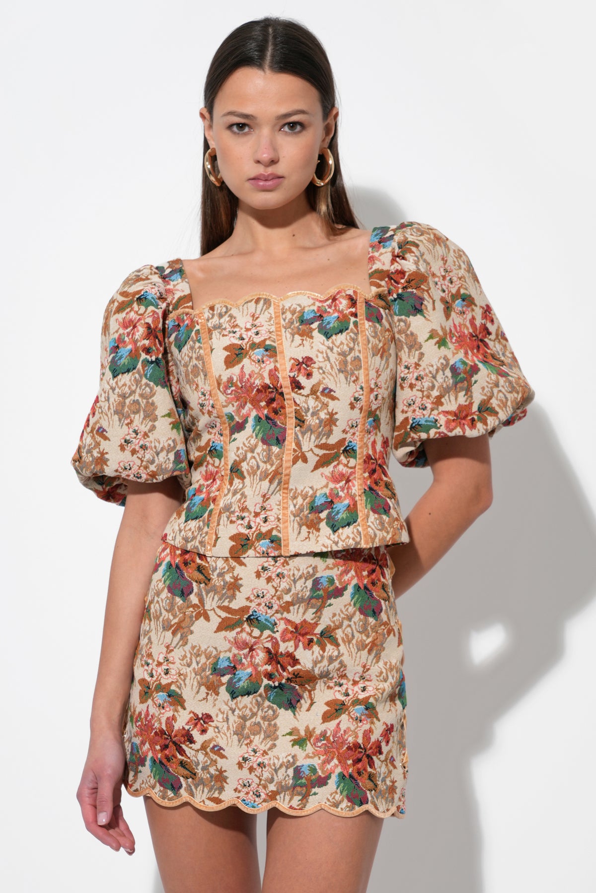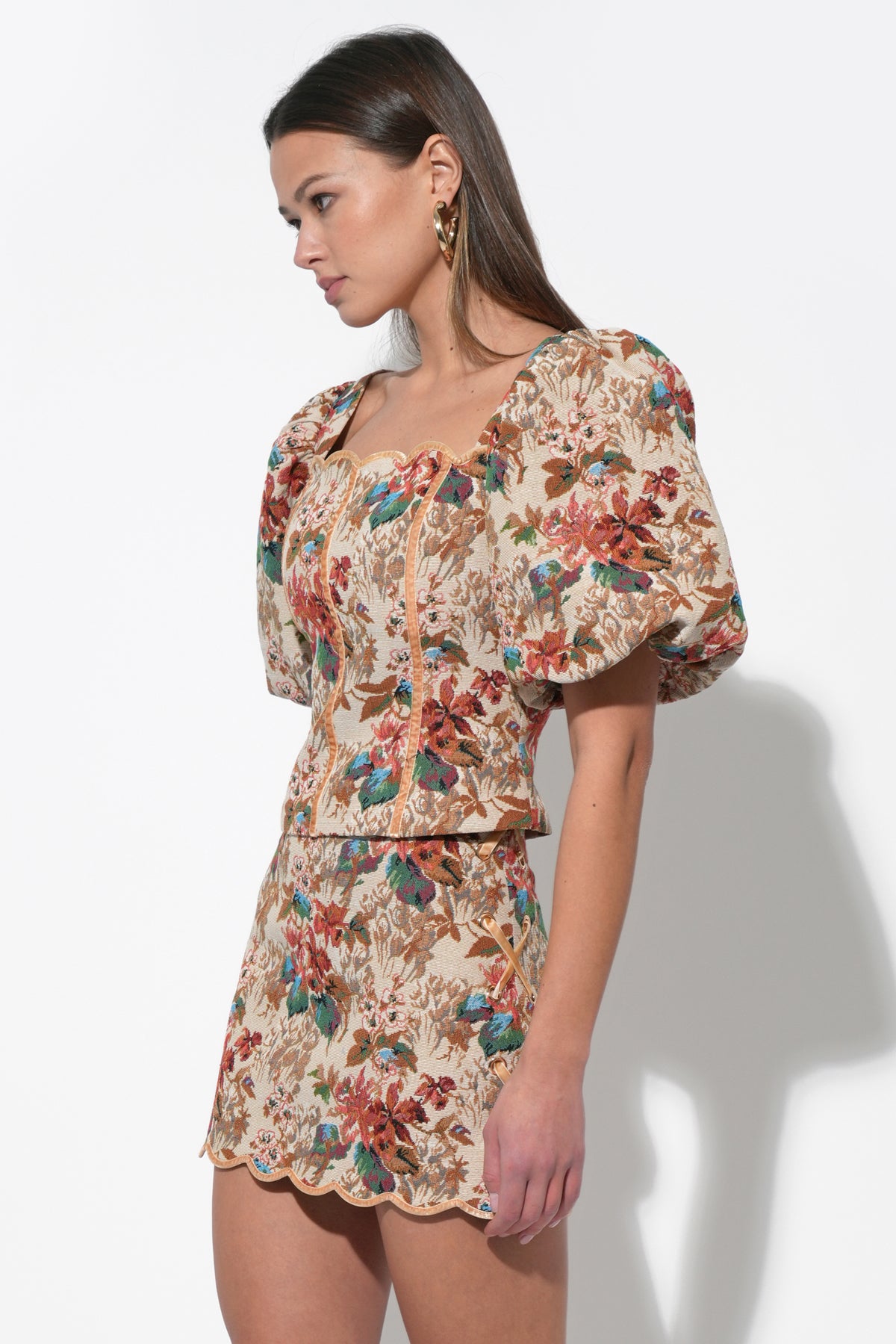 This captivating mini skirt showcases a rich, multi-colored tapestry-inspired print, blending hues of blue, orange, and cream for a unique and vibrant appeal. It features a stylish lace-up detail at the front, adding an edgy yet feminine touch, and is designed with a flattering fitted silhouette.