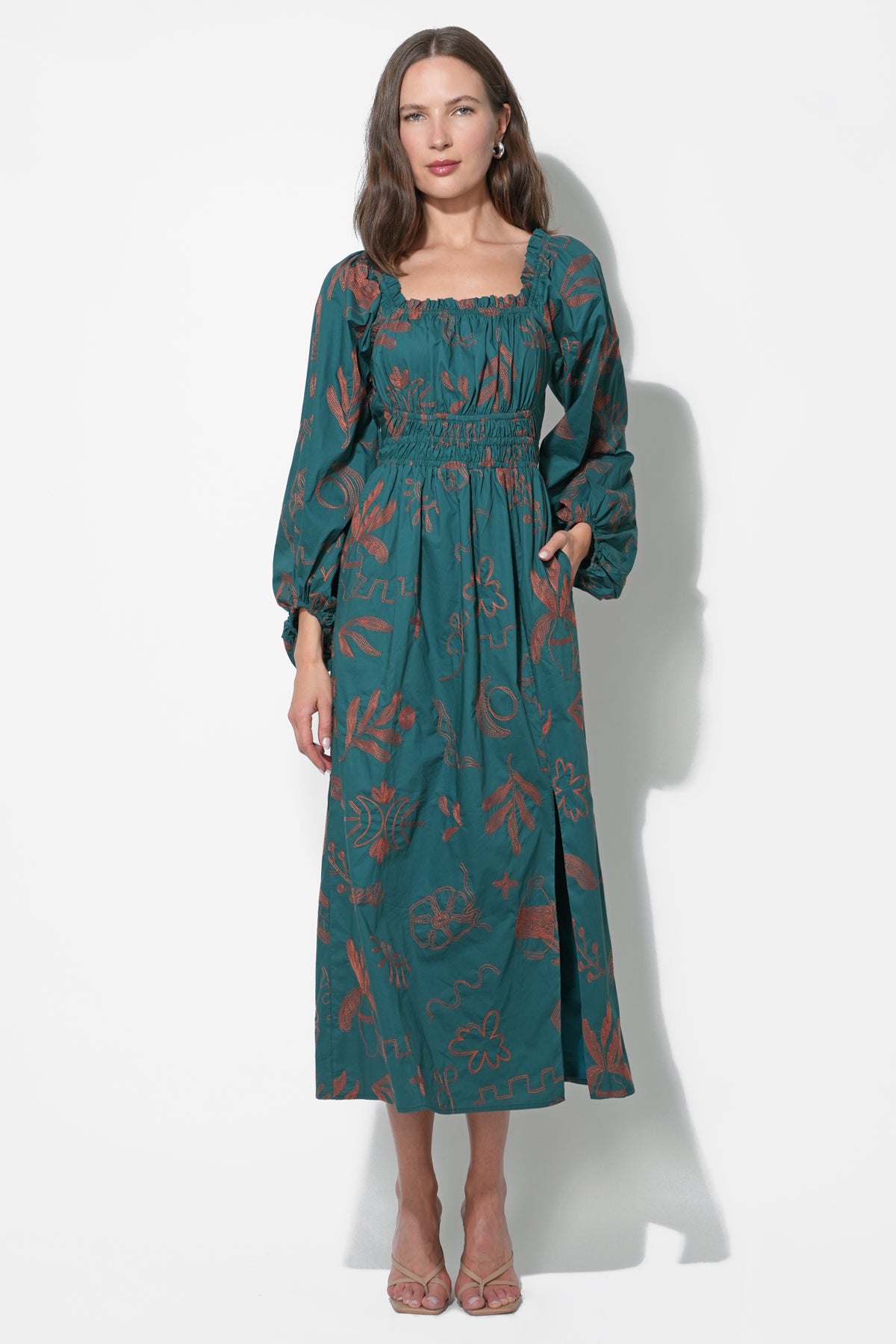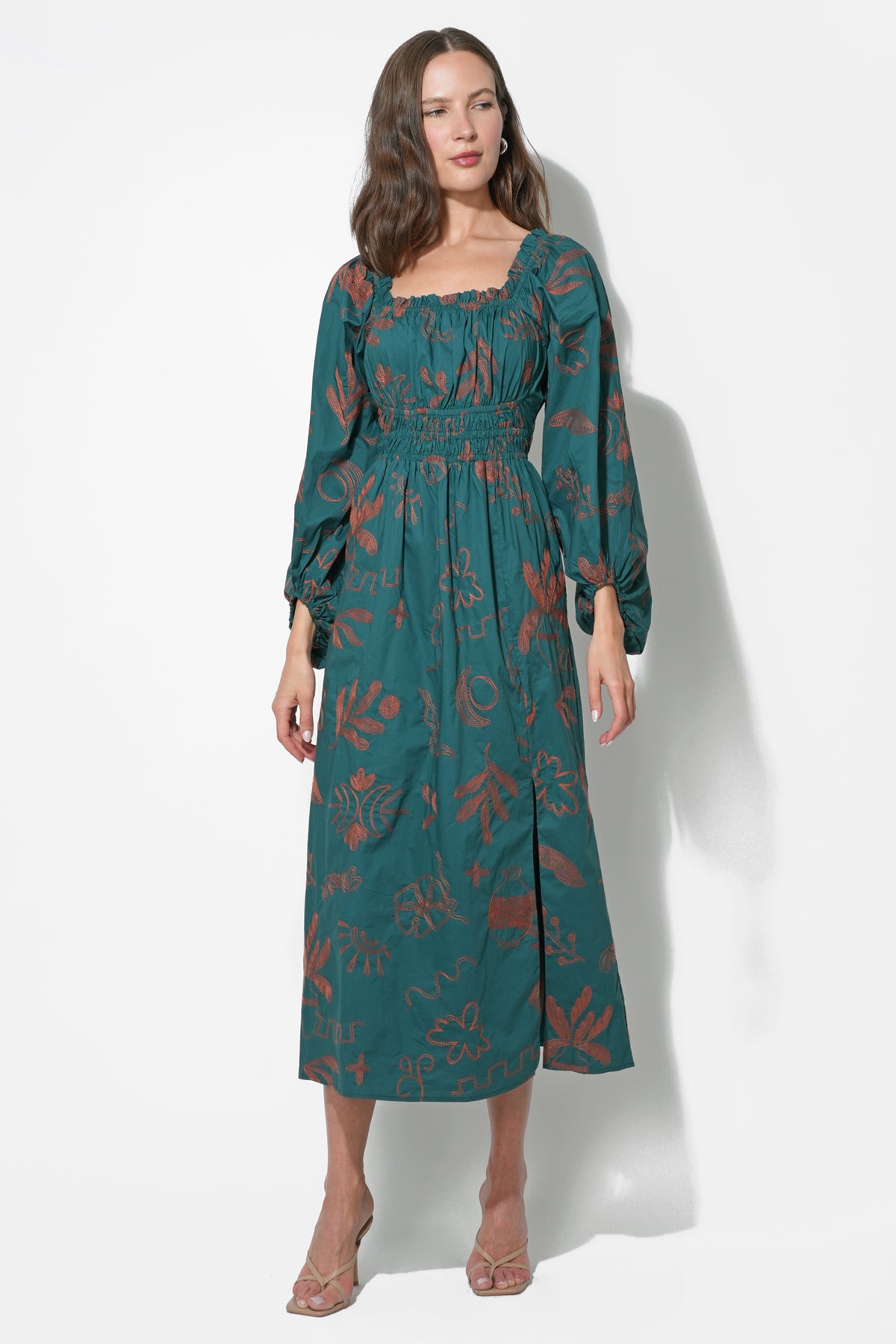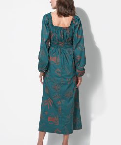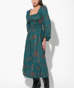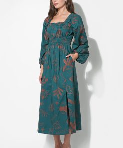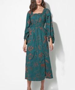 Adelyn Rae Women’s Magnolia Smocked Bodice Midi Dress | Teal & Rust
