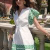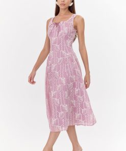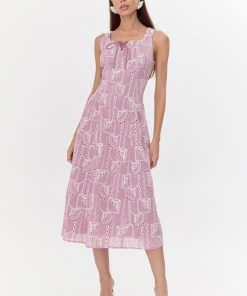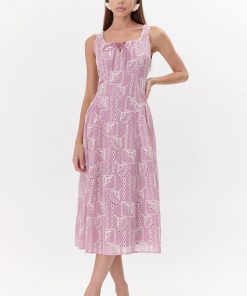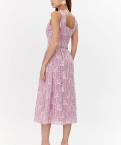 Making a grand statement, this midi dress is made of an embroidered, pink fabric.. The “Maven Dress” shows off a square neckline with a tied detail and a basque waistline for a flattering fit.