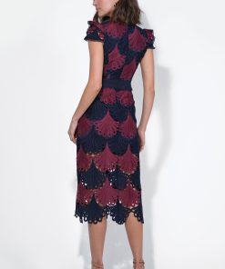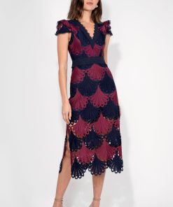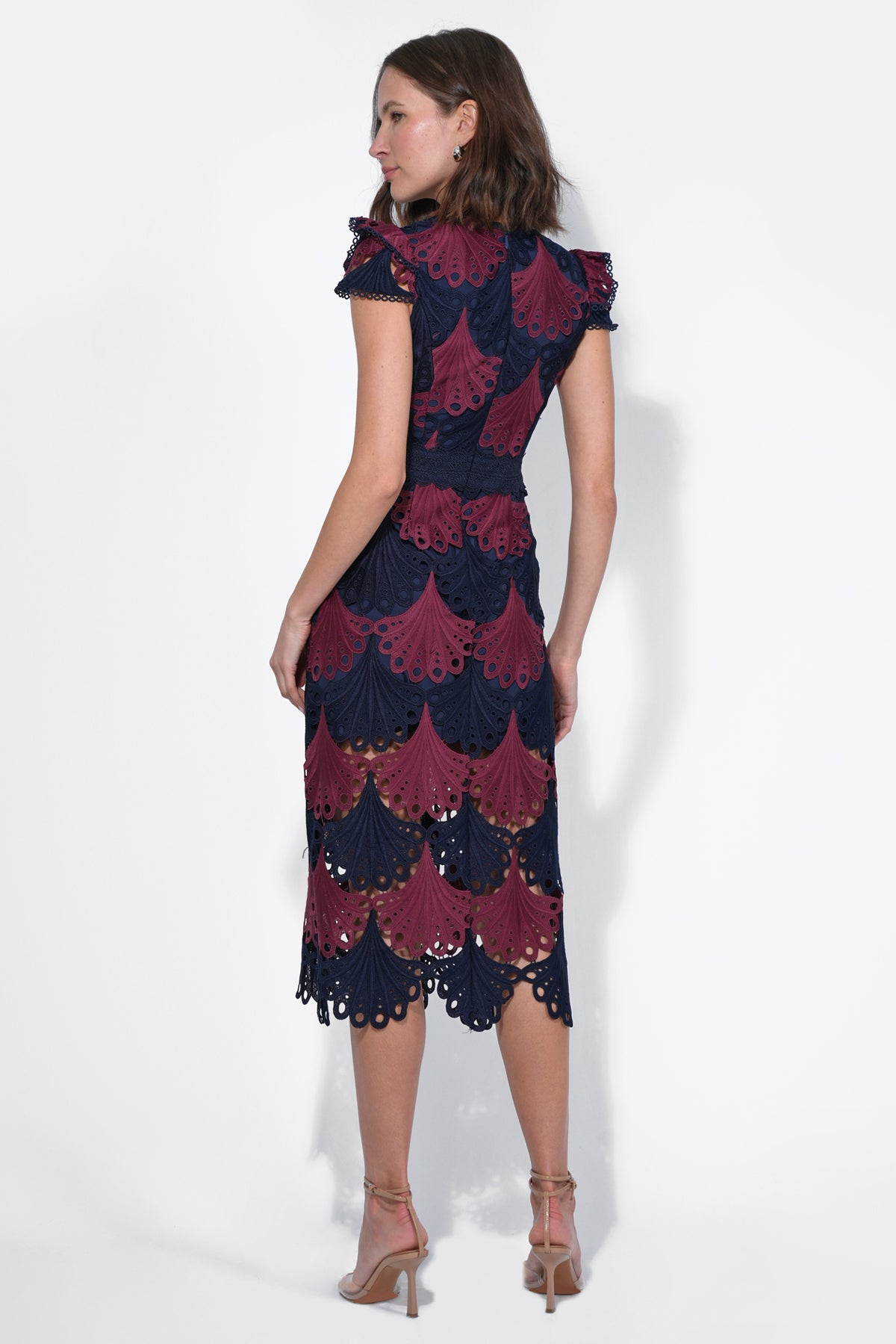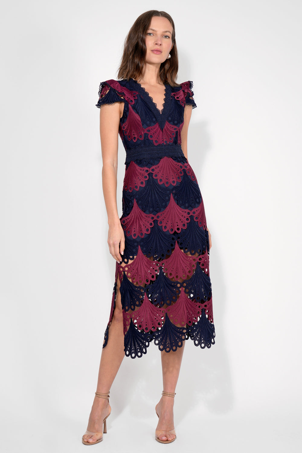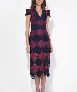 This exquisite midi dress, in a delicate light hue, is a vision of intricate beauty, adorned with stunning crochet lace detailing throughout its design. It features a gracefully plunging V-neckline and delicate spaghetti straps, offering a hint of allure.
