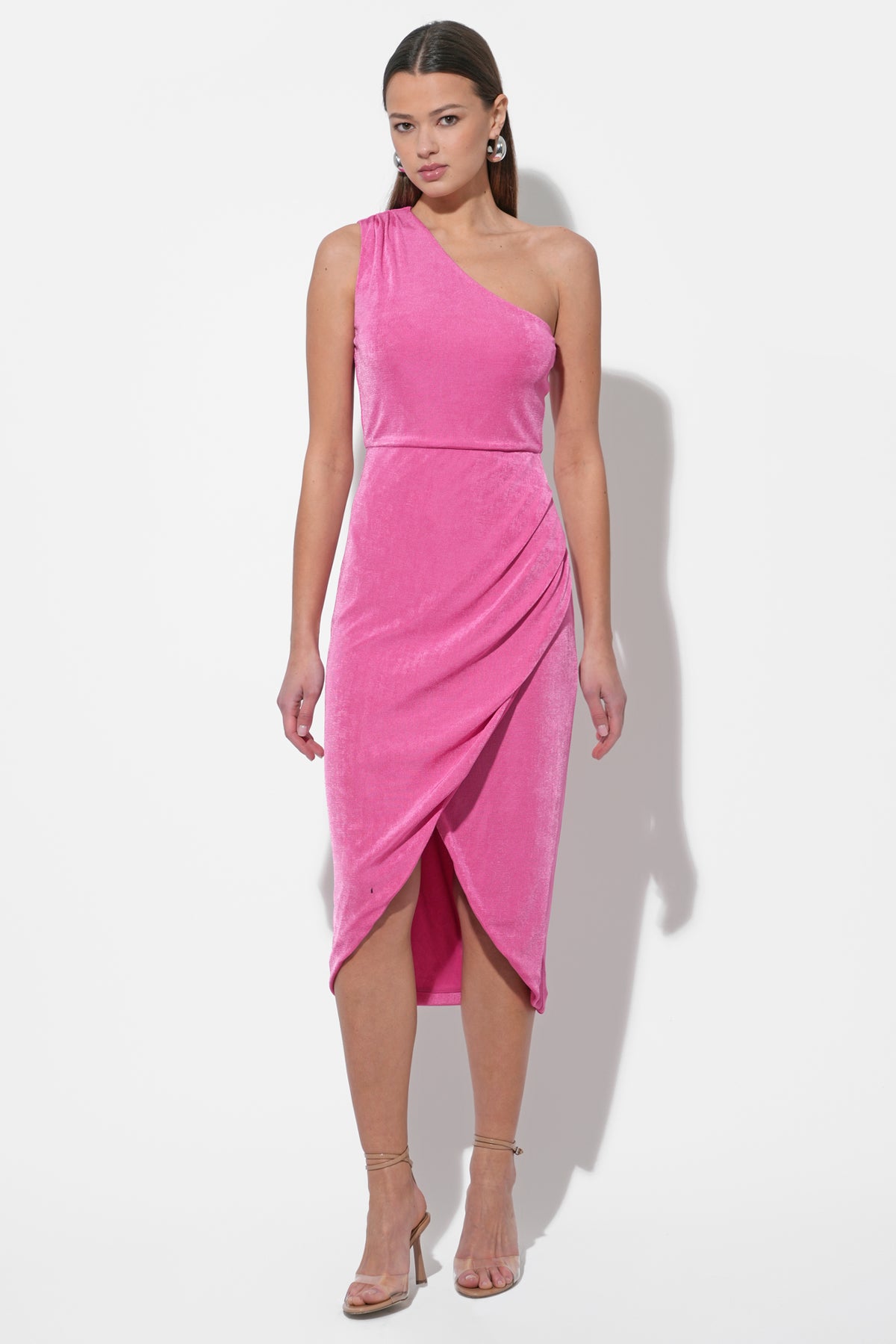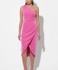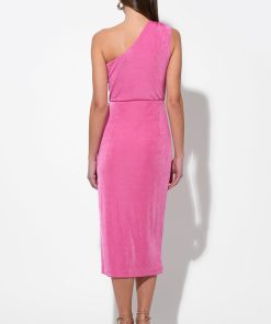 This captivating midi dress in a vibrant pink hue features a luxurious, subtly textured knit fabric that drapes beautifully. The elegant one-shoulder design creates a chic and modern silhouette, while the ruched detailing at the waist enhances the figure.