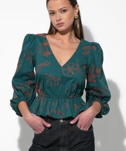 This delightful blouse, in a fresh and versatile light hue, features a flattering V-neckline that beautifully frames the décolletage. Its defining details include romantic puff sleeves, adding a touch of feminine flair, and a comfortable smocked waist that creates a beautifully cinched silhouette.