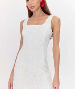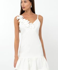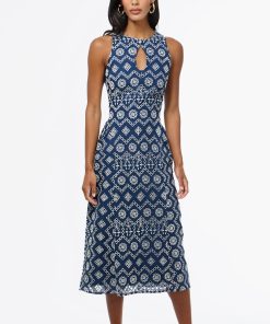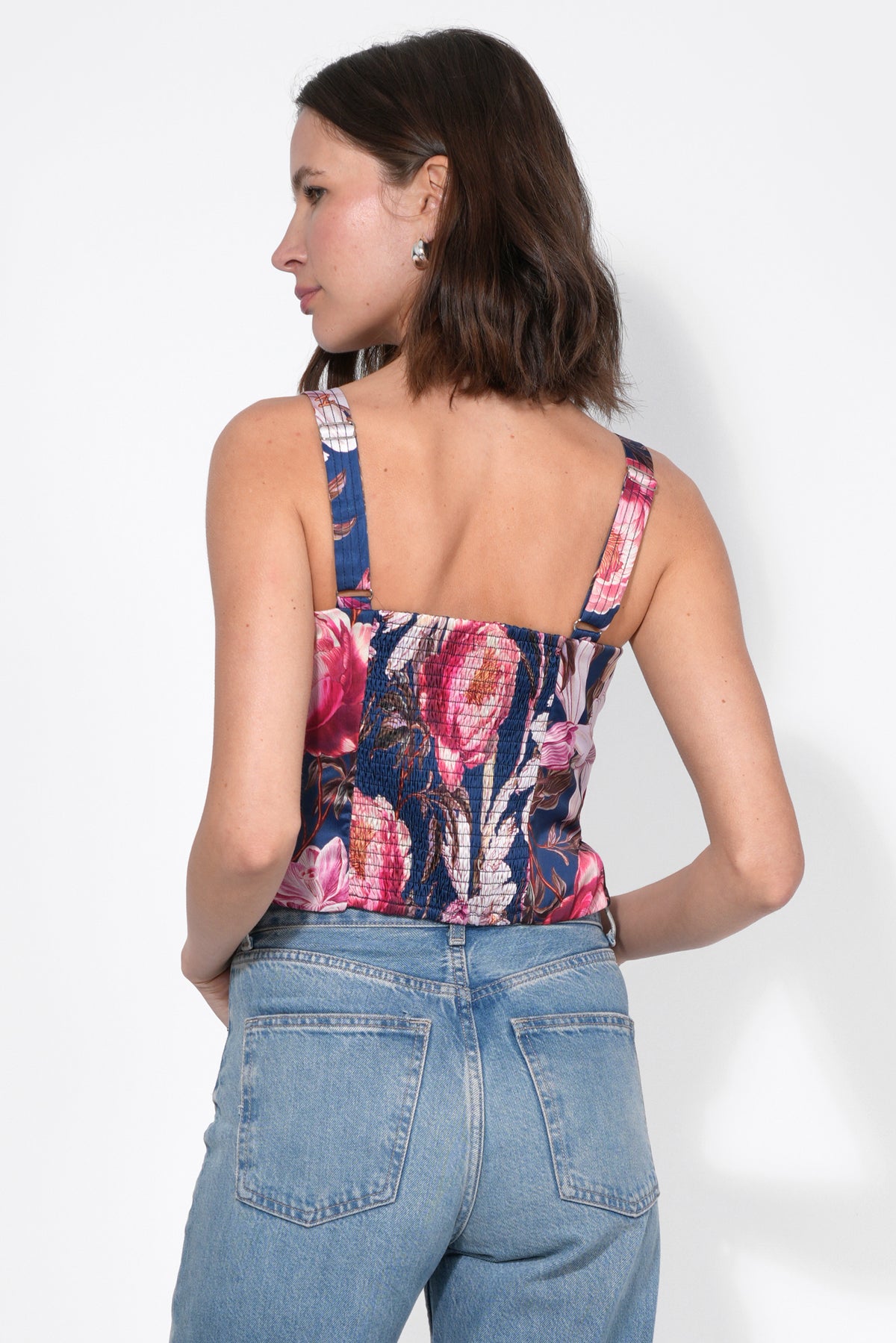 It is crafted from a smooth, lightweight fabric featuring a beautiful floral print with large pink and white blossoms against a navy background. The top has a flattering square neckline and wide straps with delicate pleat details.