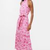 It is crafted from a smooth, lightweight fabric featuring a beautiful floral print with large pink and white blossoms against a navy background. The top has a flattering square neckline and wide straps with delicate pleat details.