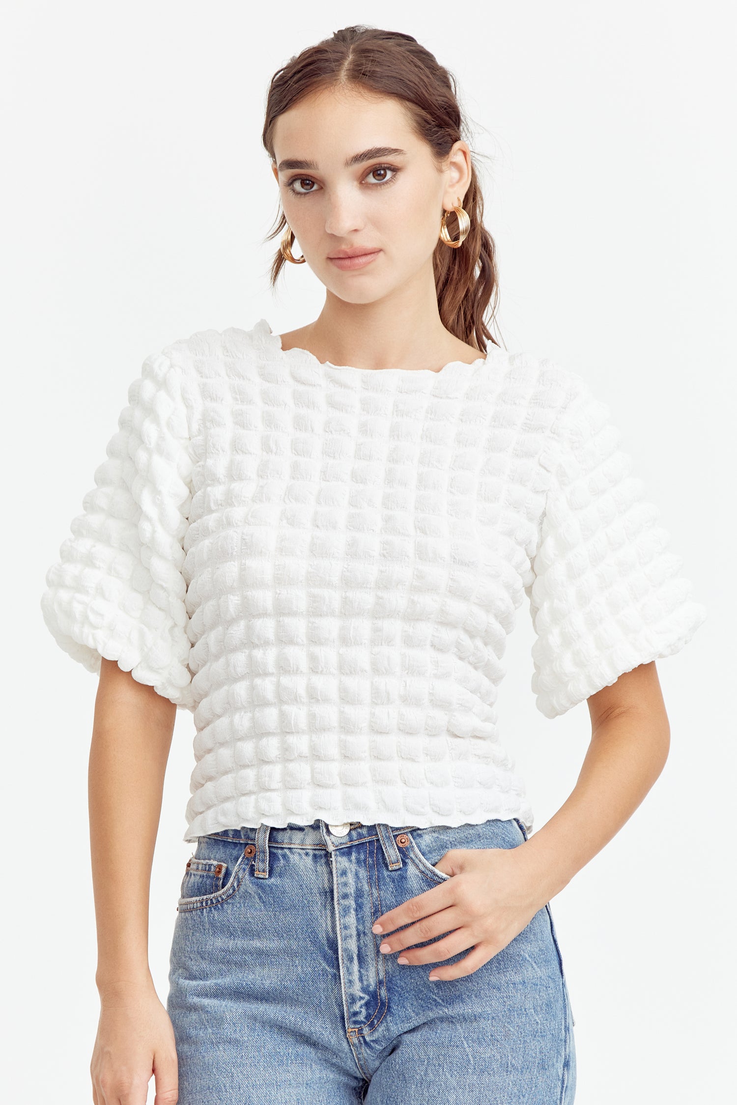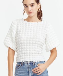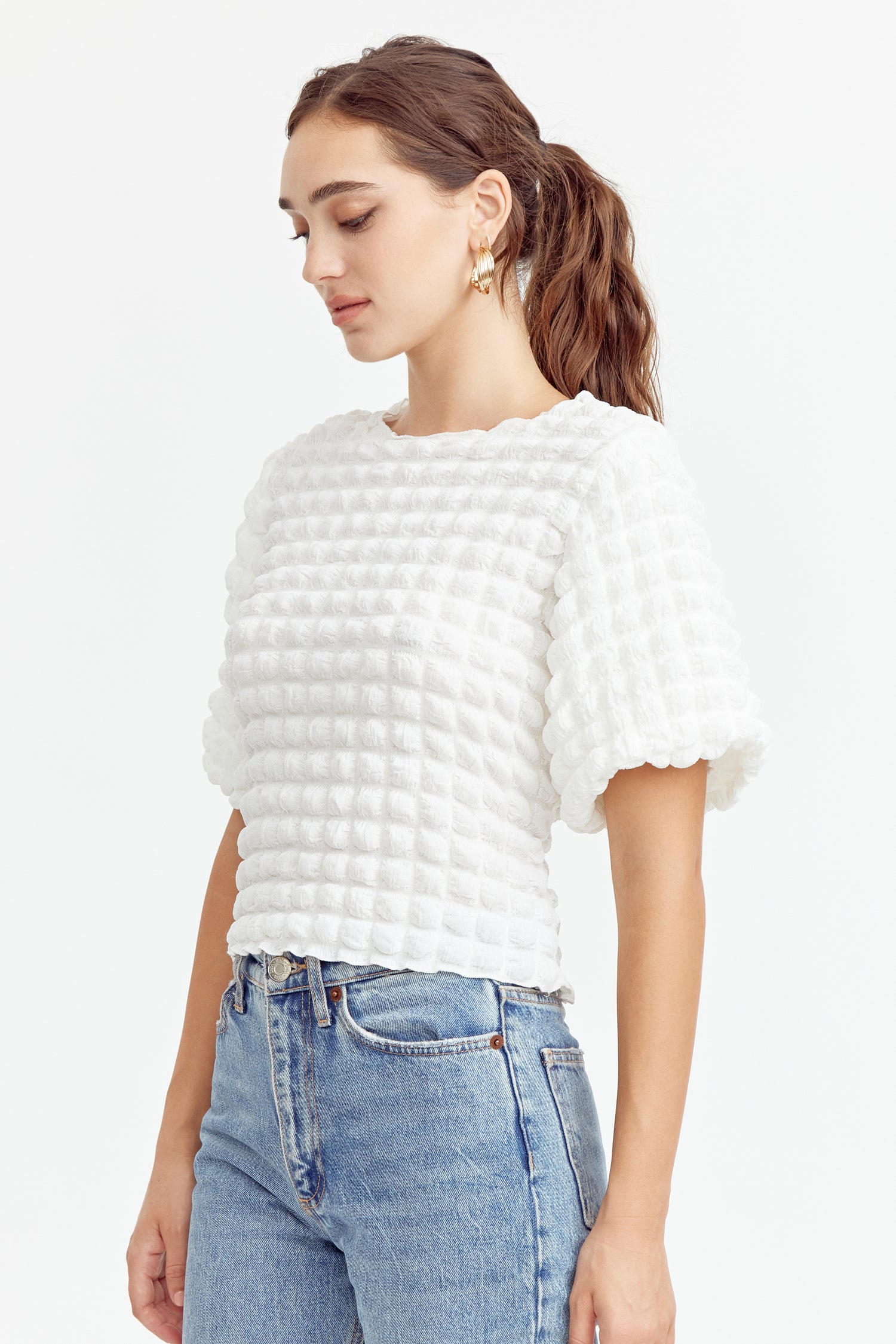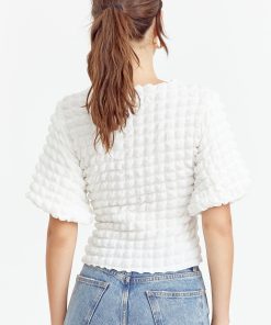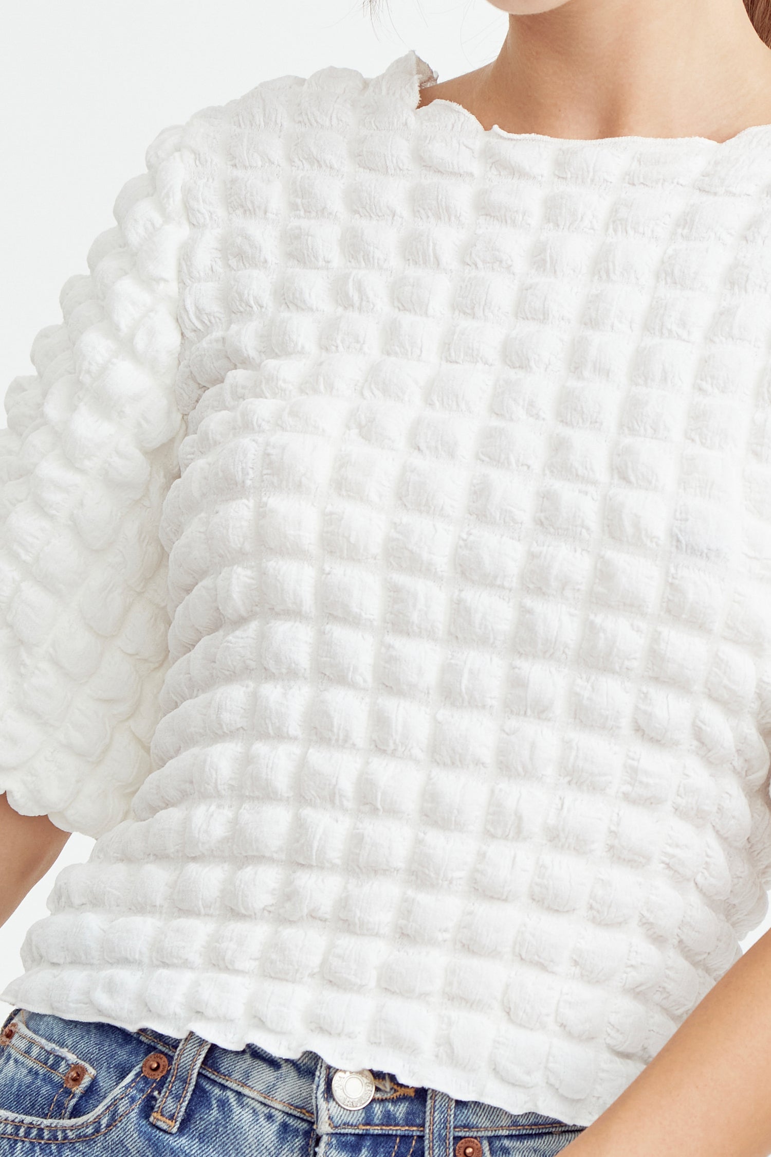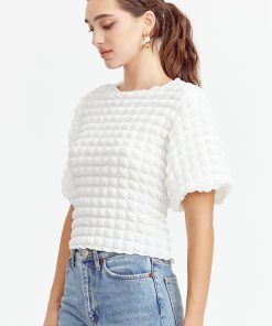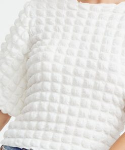 This delightful addition to your wardrobe creates a playful and tactile allure, while the elegantly elbow-length sleeves offer a touch of refinement. Perfect for casual and chic occasions, this top seamlessly blends comfort and style making it a versatile and fashionable choice for any setting.