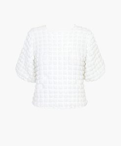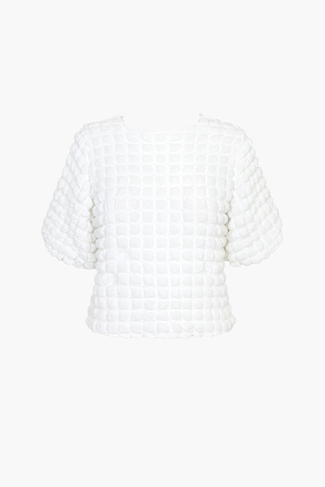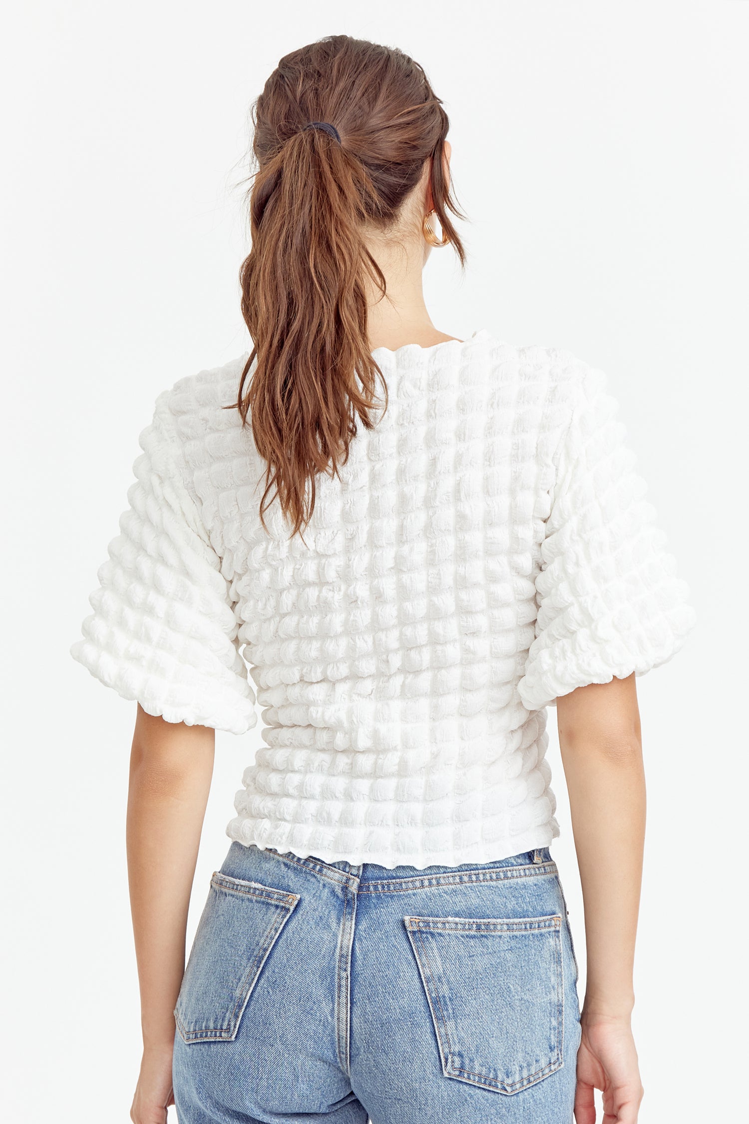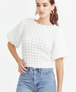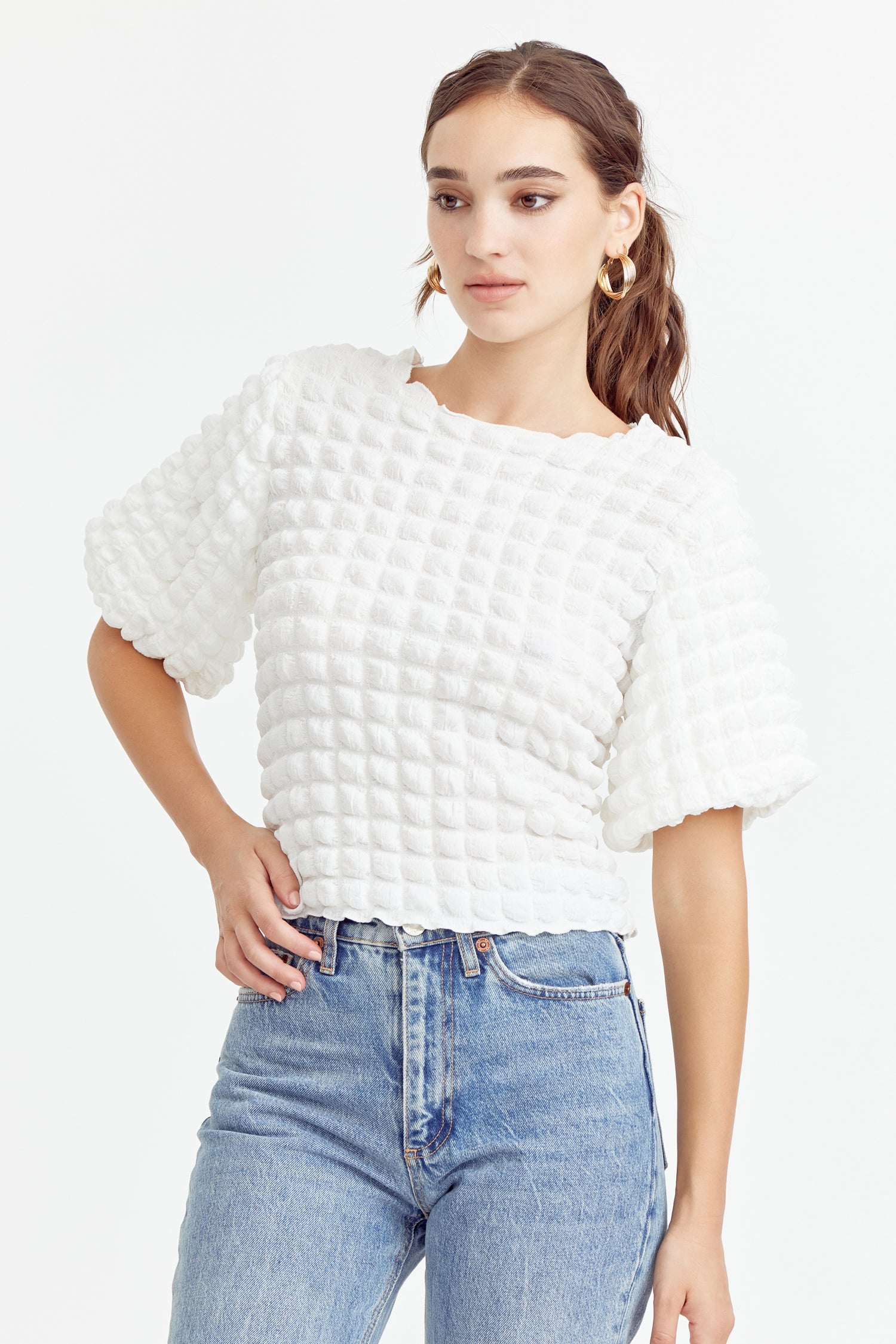 This delightful addition to your wardrobe creates a playful and tactile allure, while the elegantly elbow-length sleeves offer a touch of refinement. Perfect for casual and chic occasions, this top seamlessly blends comfort and style making it a versatile and fashionable choice for any setting.