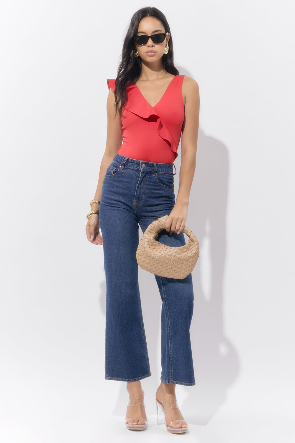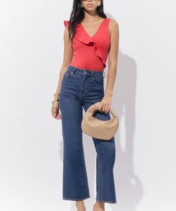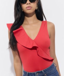 The asymmetrical ruffle detail adds playful movement, while the V-neckline and clean silhouette keep it effortlessly flattering. Designed in a vibrant red, this suit brings confident energy whether you’re beach-bound or headed to a weekend getaway.