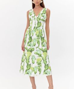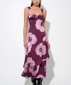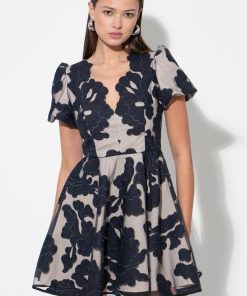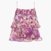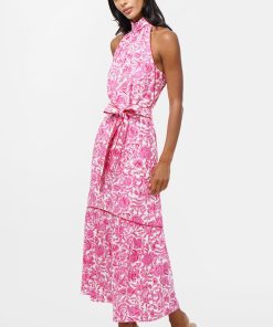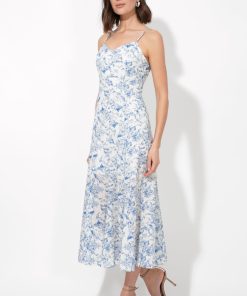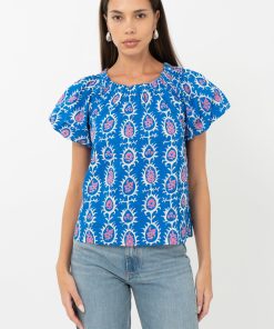 Blue top rendered in a pink and white print. The garment features an elasticated neckline that can be styled as an off shoulder piece.