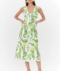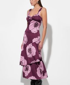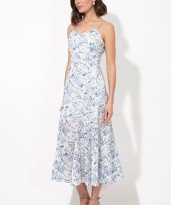 Blue top rendered in a pink and white print. The garment features an elasticated neckline that can be styled as an off shoulder piece.