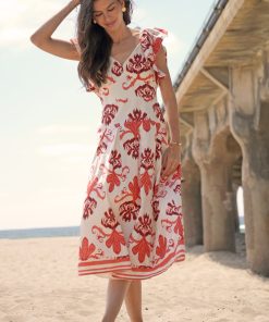 A dress made for sun-soaked days and golden hour moments. The Rosa Midi Dress features a vibrant red-and-ivory print, fluttery ruffle straps, and a fitted bodice that flows into a breezy A-line skirt. A smocked back with an adjustable tie adds comfort and shape, while the bold pattern gives a nod to getaway style with a polished twist.