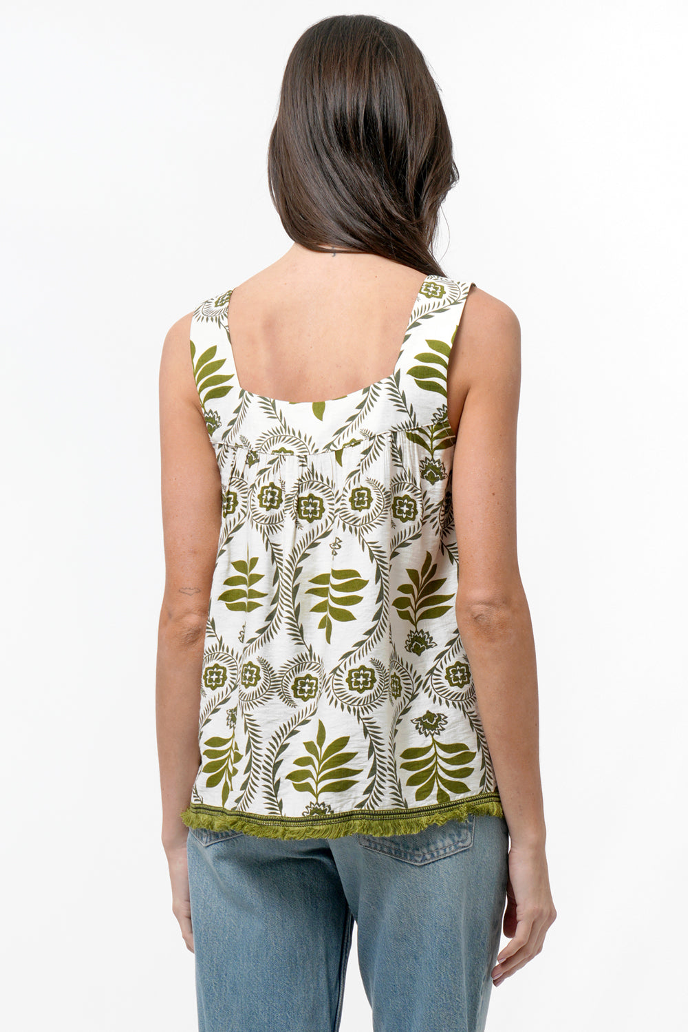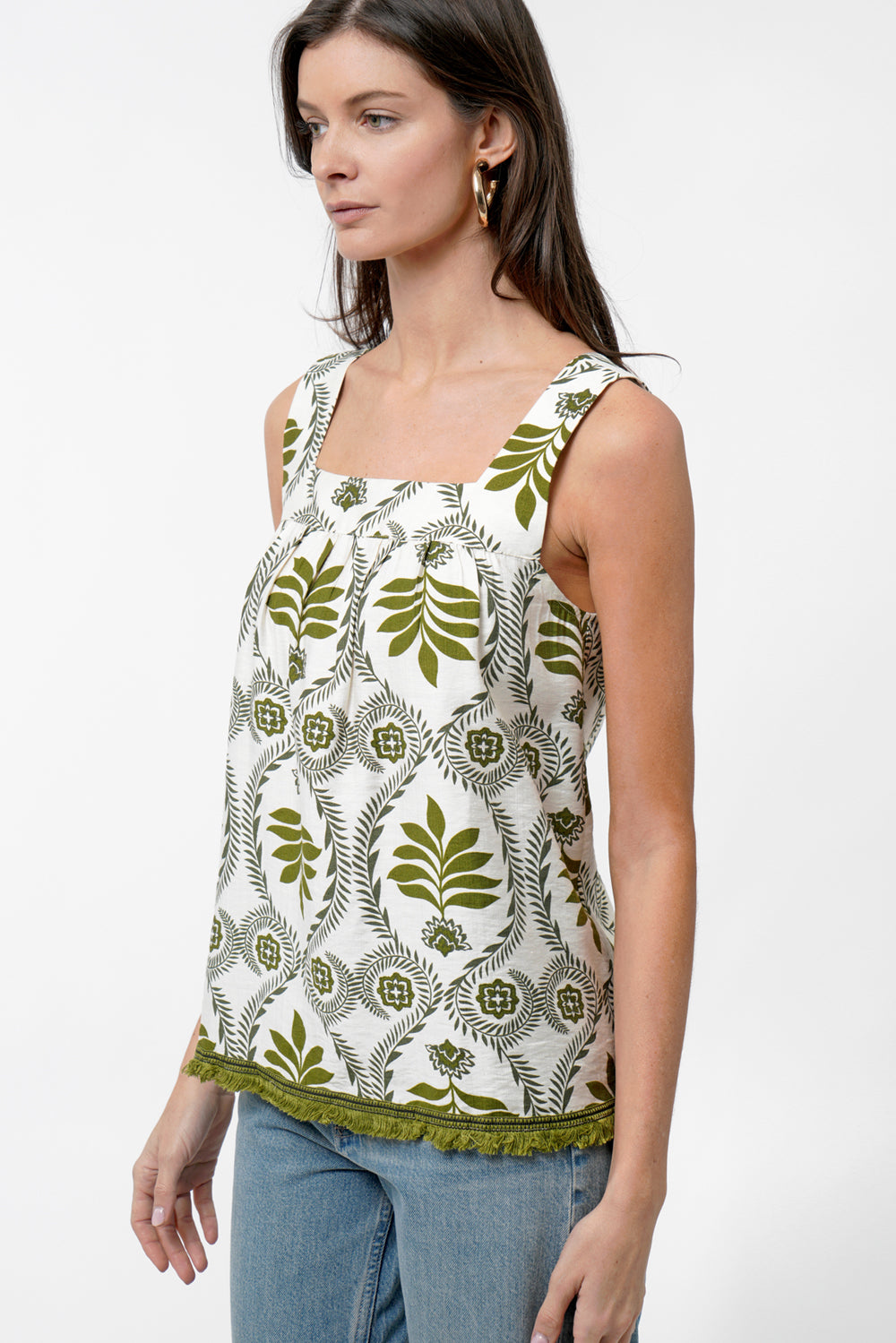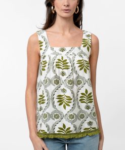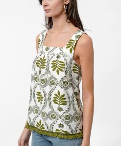A fresh take on sunny-day style. The Roy Top features a leafy green print on a lightweight cotton blend, designed with a flattering square neckline and wide shoulder straps. Pintuck pleats add a soft touch of volume, while the fringe trim at the hem gives it a playful finish. The relaxed fit pairs effortlessly with denim or a crisp white skirt.