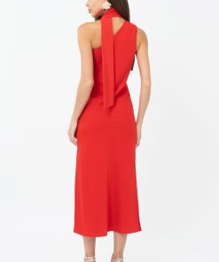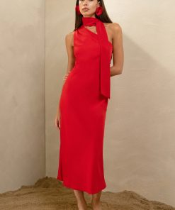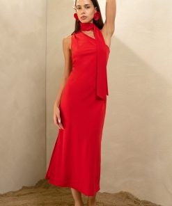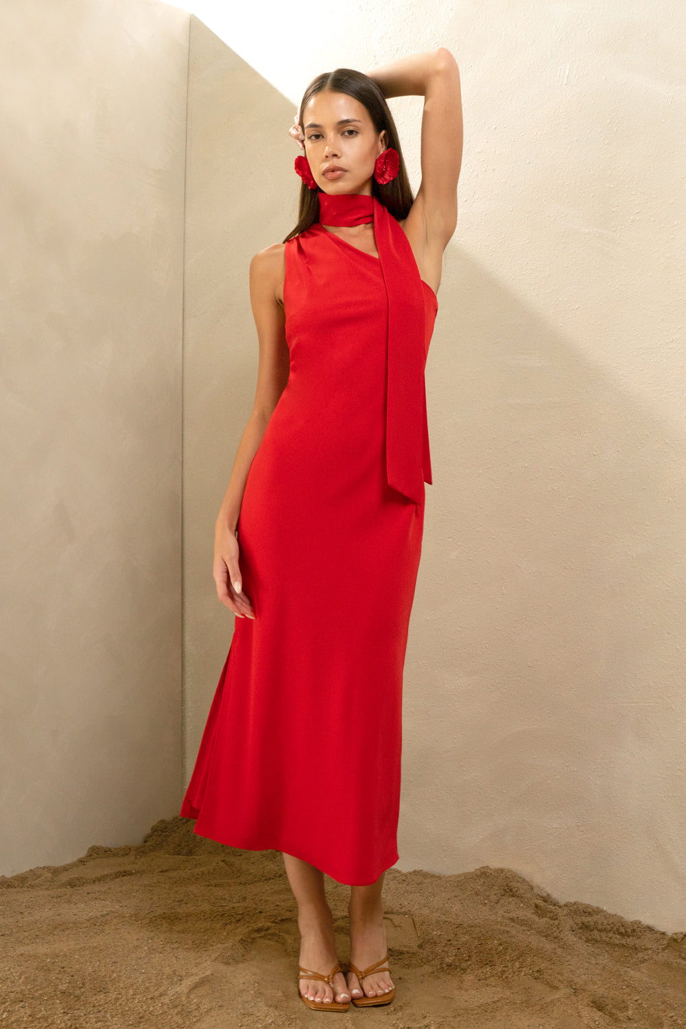 The Saffron Dress is a one shoulder dress that falls to a midi dress. It features an attached scarf which can be worn or tied in various ways.