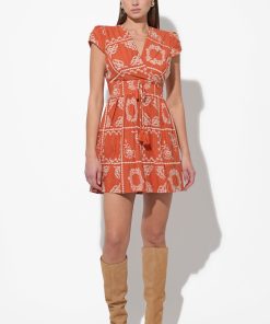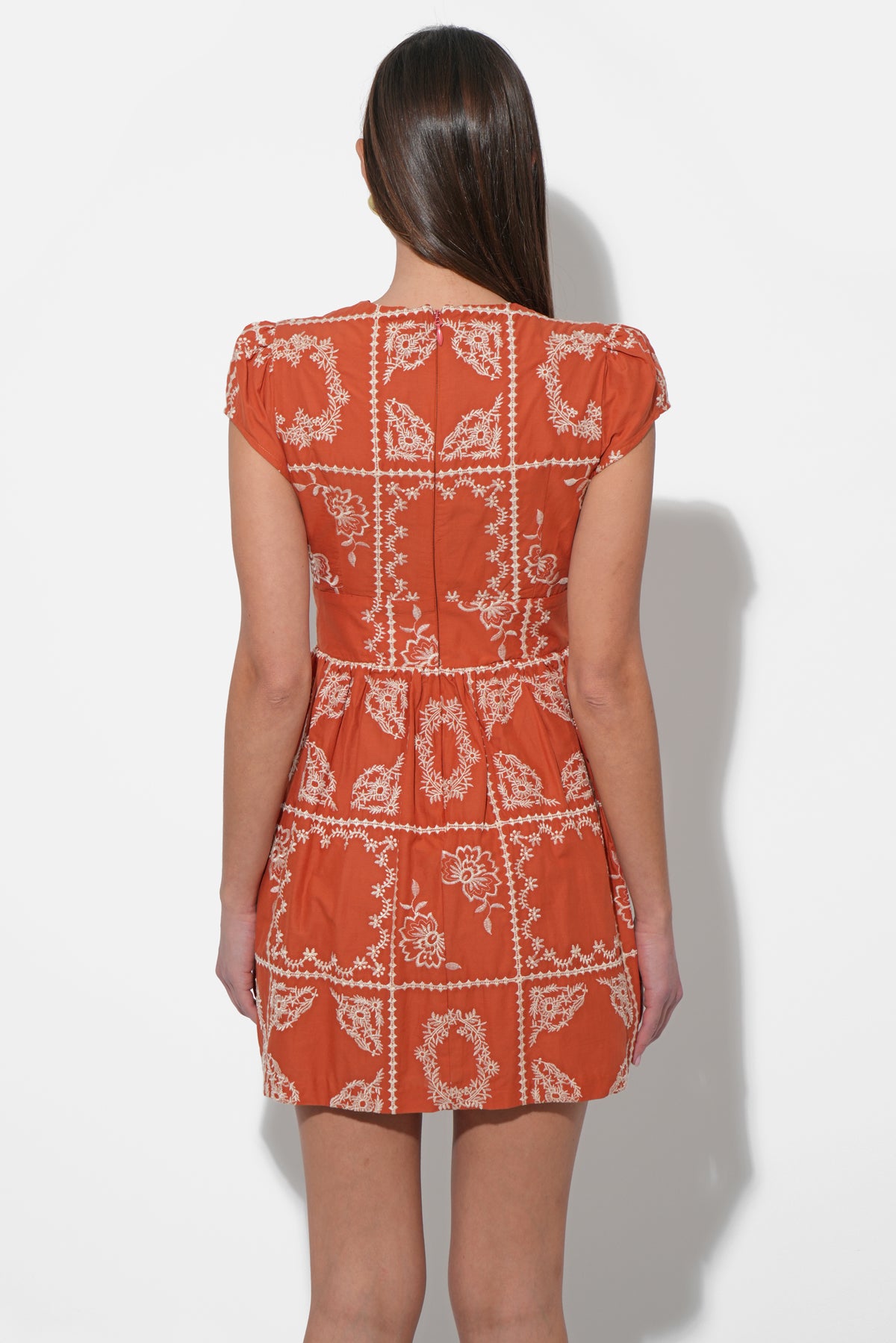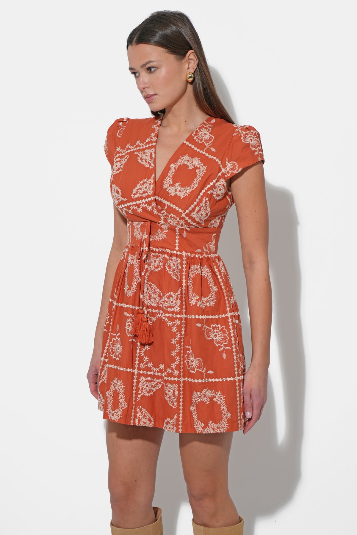 This delightful mini dress, in a fresh white or cream hue, is adorned with delicate embroidery that adds a touch of artisanal sophistication to its design. It features a flattering V-neckline and sweet cap sleeves, along with a defined waist enhanced by a playful tie detail.