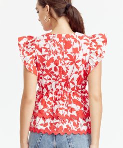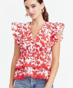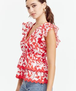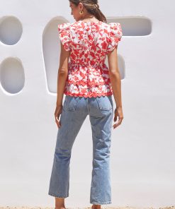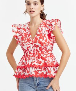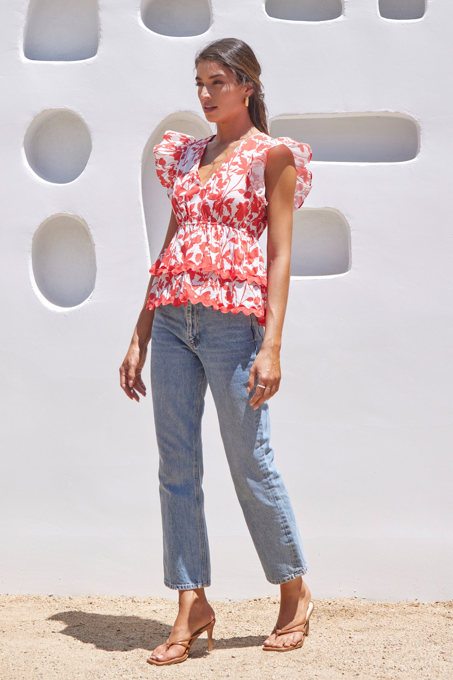 This blouse features a two-layer peplum silhouette. Other key designs of the floral piece are the ruffled shoulders and V-neckline. Dress with jeans and heels for a party setting.