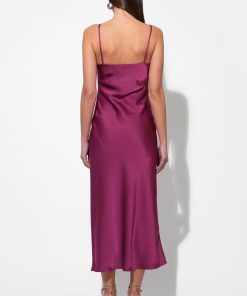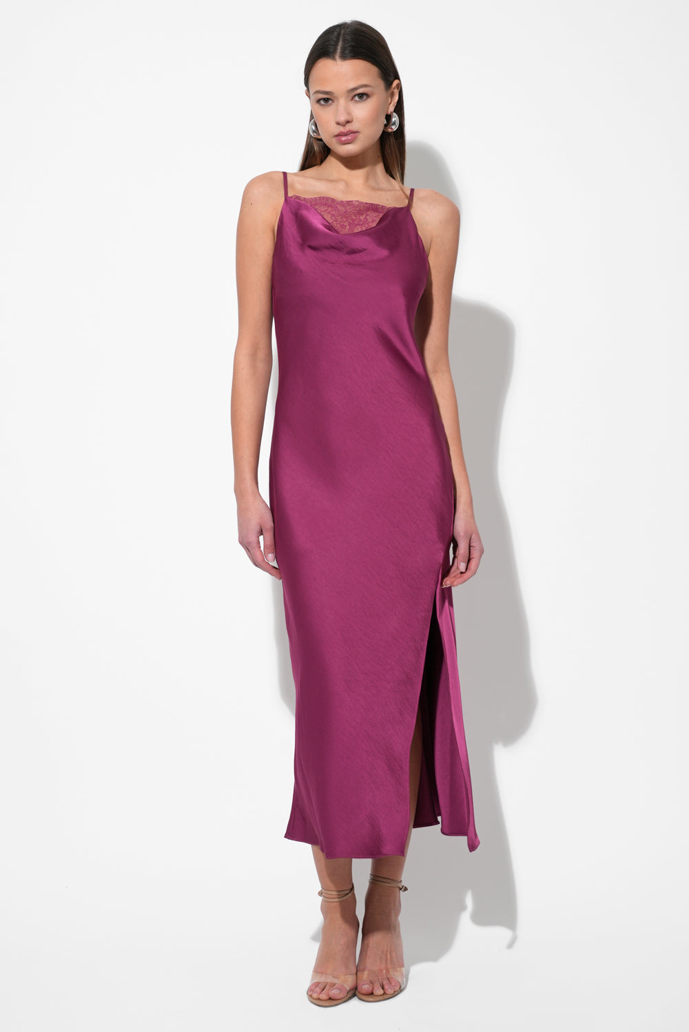 This stunning midi-length slip dress, in a captivating vibrant pink hue, drapes beautifully to flatter every curve. It features a luxurious cowl neckline that softly cascades, exuding refined allure, and delicate spaghetti straps for a minimalist yet chic appeal.