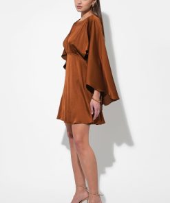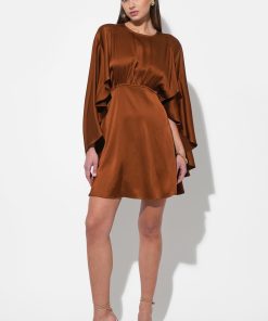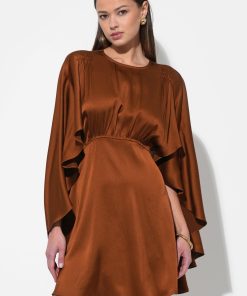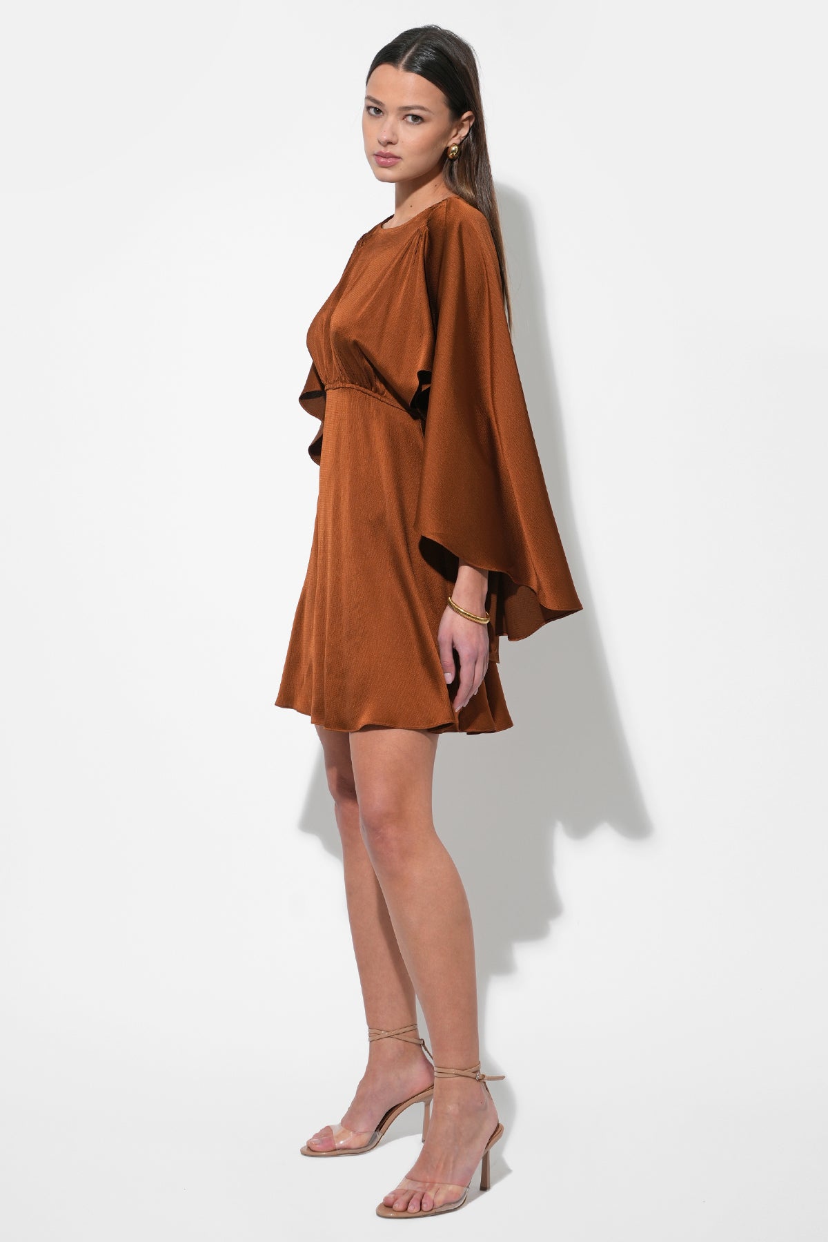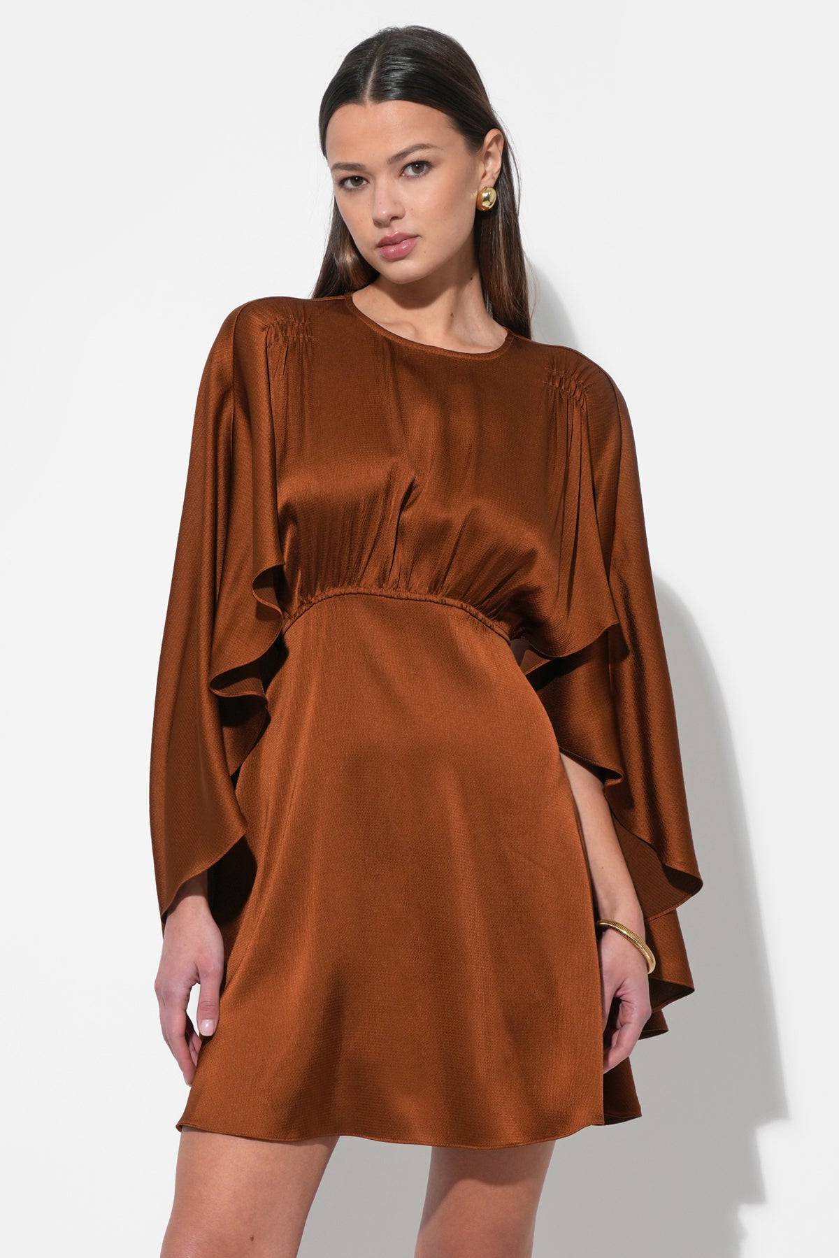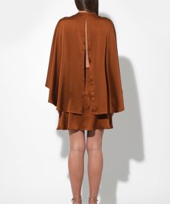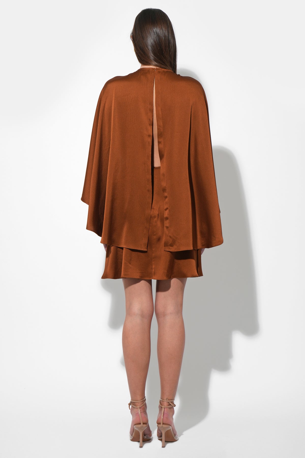 This elegant mini dress, in a rich toffee hue, offers a unique and modern silhouette. It features a sleek, high neckline and a dramatic cape overlay that drapes gracefully over the shoulders and down the back, creating a fluid and memorable look.