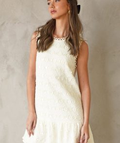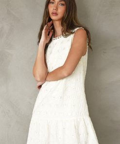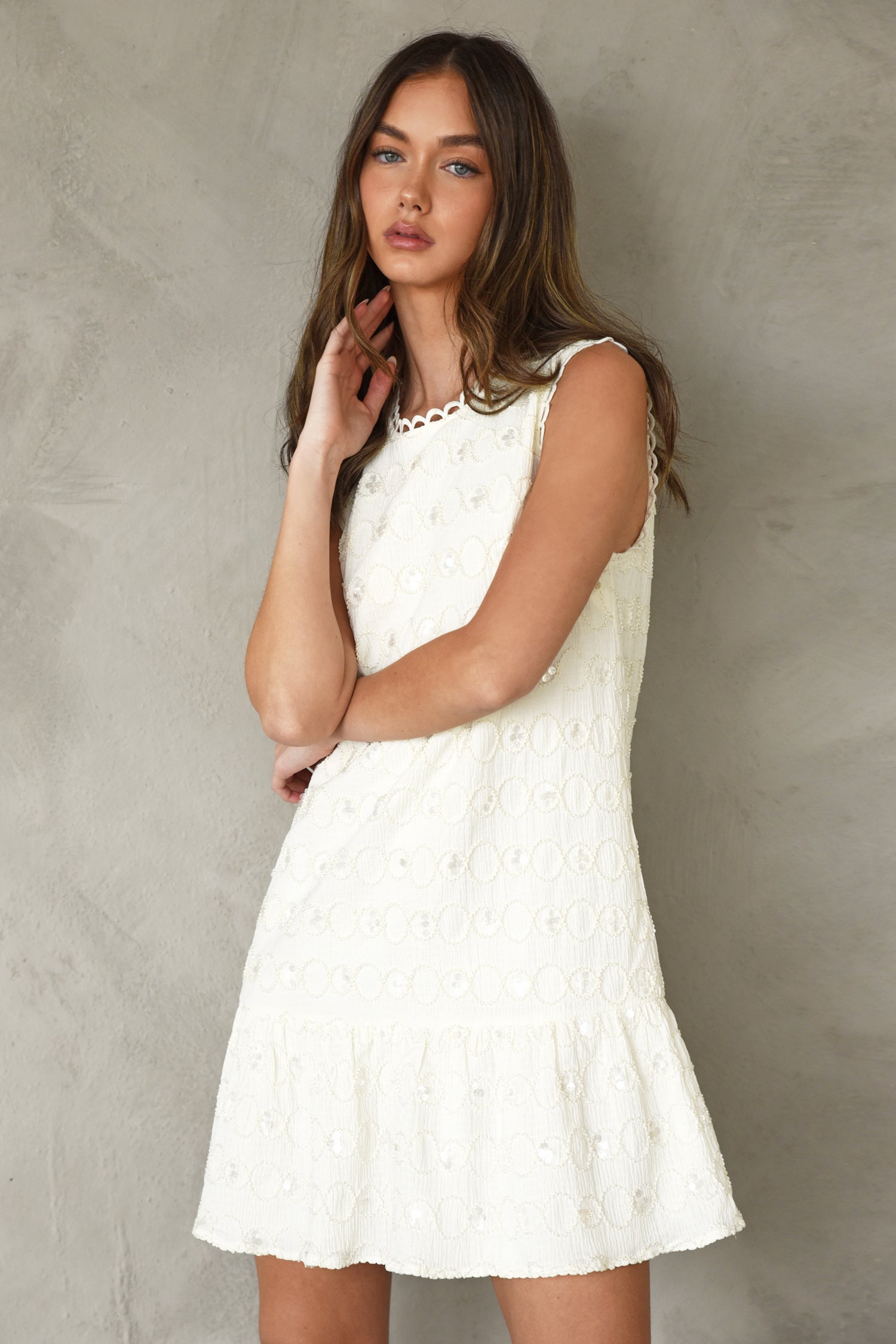 Sleeveless, drop waist mini dress with textured fabric. The neckline and shoulders are lined with lace detailing.